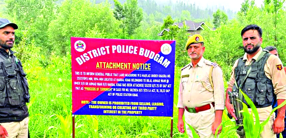 Budgam, July 16: In a major crackdown on terror operatives and their support structures, Budgam Police on Wednesday attached three properties belonging to Pakistan-based terrorist handlers (JKNOP) located in Khag, Chewa Beerwah, and Harwani Khansahib areas of Jammu and Kashmir’s (J-K) Budgam district, officials said.