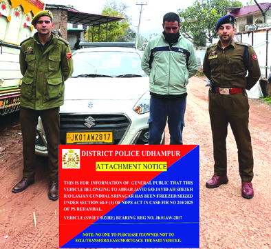 Early Times Report UDHAMPUR, Jan 31: Udhampur Police has attached a movable property worth approximately Rs 10 lakhs in the form of a Maruti Suzuki Swift Dzire bearing Registration No. JK01AW-2817 belonging to Inter-District drug peddler namely Abrar Javid S/O Javid Ahmed Sheikh, R/O Lasjan, Gundbal, Srinagar under Section 68-F of the NDPS Act. The attachment has been made in connection with FIR No. 210/2025 U/S 8/21/22 of the NDPS Act registered at Police Station Rehambal. The attached vehicle was found to be proceeds of crime generated through illicit narcotics trafficking. During the course of investigation, detailed financial scrutiny and backward link analysis established that the accused had acquired the said vehicle using money earned from illegal drug trade. Based on these findings, the order of attachment has been passed today for further legal proceedings. With this action, Udhampur Police's NDPS-related property attachment this year stands at Rs 1.50 crore, underscoring its firm crackdown on drug peddlers. |