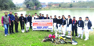 | NSS Unit of GDC Khour organizes cleanliness drive in adopted pond at Village Naryana | | | Early Times Report KHOUR, Feb 18: The National Service Scheme (NSS) unit of Government Degree College Khour has demonstrated its commitment to cleanliness & community services by organizing a dedicated cleanliness drive in adopted pond (water body) at village Dhangri, Naryana on the third day of the ongoing seven Days NSS Special Winter Camp. The drive was conducted under the able leadership of Prof. (Dr) T. K. Sharma, Principal and under the supervision of Prof. Himanshu Khajuria, NSS Programme Officer. About 30 NSS volunteers of the College participated in the cleanliness drive of the pond with the aim to revamp and conserve the natural water source to prevent its slow deterioration due to pollution. The revamping work include removal of filth, weeds, piled up plastic waste from the pond to ensure its cleanliness as it serves as drinking water for various animals like cows, horses, sheep etc of the local area. The principal of the College appreciated the efforts and dedication of NSS volunteers. Dr. Anil Kumar Dogra, Prof. Sunil Kumar (PTI) & Dr. Ranjan Sharma also participated in the cleanliness drive. |