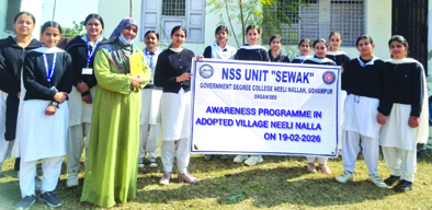 Early Times Report UDHAMPUR, Feb 20: The NSS Unit Sewak of Government Degree College Neeli Nallah Udhampur organized a one-day Awareness Programme in its adopted village, Neeli Nallah, under the esteemed guidance of Dr. Seema Arora, Principal of the College. The programme was efficiently conducted by Prof. Shaista Yasmeen, NSS Programme Officer, along with active participation of NSS volunteers. The programme aimed at spreading awareness among villagers regarding road safety, cleanliness, and the constructive role of youth in rural development. The event began with an Awareness Rally on Road Safety in which NSS volunteers carried placards and raised slogans highlighting the importance of traffic rules, helmet usage, and responsible driving. The rally received positive response from the local community. This was followed by a visit to the Panchayat Ghar, Neeli Nallah, where volunteers interacted with Panchayat representatives and discussed developmental issues of the village. The interaction strengthened coordination between the college and local governance. A Cleanliness Drive was also conducted in and around the village area. Volunteers actively participated in cleaning public spaces and spreading awareness about sanitation and environmental hygiene. On the occasion, Prof. Shaista Yasmeen delivered a lecture on the importance of the NSS Unit in the development of the adopted village. She emphasized the NSS motto "Not Me But You" and encouraged volunteers to actively contribute towards social upliftment and nation-building. The programme concluded with an experience-sharing session, where NSS volunteers expressed their views and reflected upon their learning experiences through community service. The entire programme was successfully conducted and appreciated by villagers. It reaffirmed the commitment of the NSS Unit Sewak towards community engagement, social awareness, and holistic rural development. |