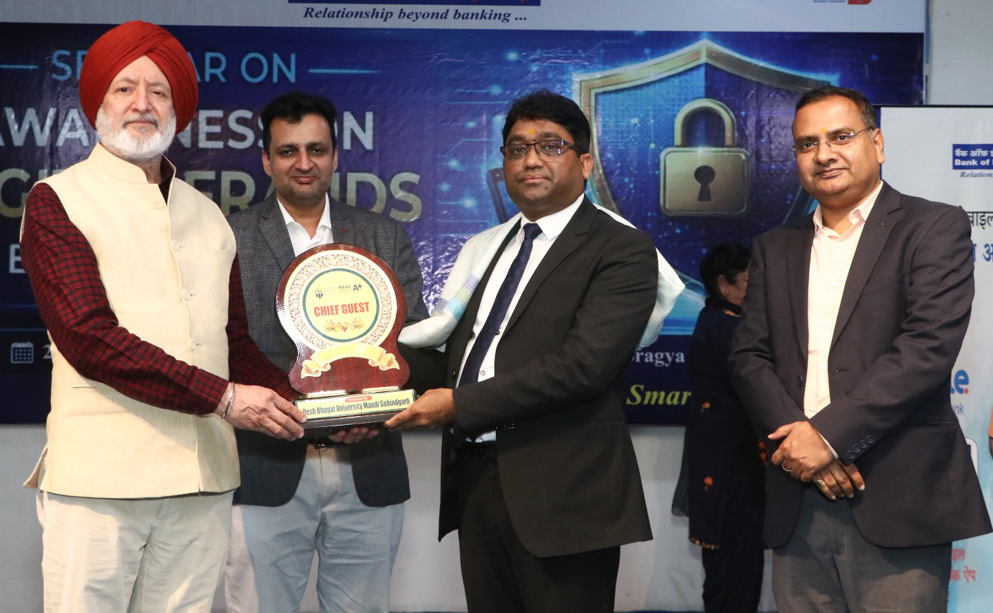Early Times Report MANDI GOBINDGARH, Mar 2: Bank of India conducted a seminar on "Awareness on Digital Frauds in the Banking Industry" at Desh Bhagat University with enthusiastic participation from students and faculty members. The program commenced with a warm welcome to the Chancellor Dr. Zora Singh, Pro-Chancellor Dr. Tajinder Kaur and Vice Chancellor Dr. Harsh Sadawarti. The Chief Guest for the occasion was Rajesh Ranjan, Zonal Manager, Chandigarh Zone, Bank of India, who conducted the awareness session. Guests of Honour included Kumar Pramod Singh, Assistant General Manager; Amandeep Singh, Manager; and Aman Guleria, Assistant Manager, Bank of India. University dignitaries, faculty members, and students actively participated in the session. Amar Sharma, CFO of the university, was also present on the occasion. During the seminar, the Chief Guest highlighted the growing concerns of digital frauds and stressed the importance of cybersecurity in banking. He explained various types of digital banking frauds and shared preventive safety measures. Awareness videos were also screened to enhance understanding among students. |