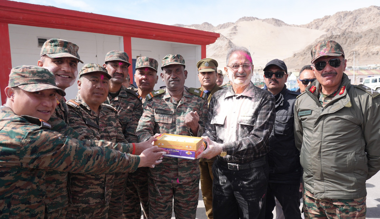 | LG Kavinder Gupta celebrates Holi with Army Jawans | | | Early Times Report LEH, Mar 5: The Hon'ble Lieutenant Governor of Ladakh, Shri Kavinder Gupta today celebrated the festival of Holi with the brave jawans of the Fire & Fury Corps, extending festive greetings and expressing deep gratitude for their unwavering service to the nation. The Lieutenant Governor was warmly received by Lt. General Hitesh Bhalla, General Officer Commanding, 14 Corps, along with Maj Gen Sudhanshu Sharma, Chief of Staff, and other senior Army officials. The special event reflected the true spirit of Holi, marked by warmth, camaraderie and vibrant celebrations. Extending heartfelt greetings on behalf of the people of Ladakh, Shri Kavinder Gupta described Holi as a festival symbolising the triumph of good over evil, the arrival of spring, and the enduring values of unity, harmony and brotherhood. He stated that while citizens across the country celebrate festivals with their families, it is the constant vigilance, courage and sacrifice of the soldiers serving in Ladakh's challenging terrain and extreme weather conditions that ensure peace and security across the nation. Interacting with the jawans, the Lieutenant Governor expressed immense pride in their exemplary service and acknowledged their invaluable contribution in safeguarding India's borders. He emphasised that celebrating festivals like Holi with the armed forces strengthens the bond between the people and the protectors of the nation. He also conveyed his best wishes to the families of the soldiers and reiterated the continued support and cooperation of the UT Administration for the welfare of armed forces personnel, ex-servicemen and their families. Highlighting that Holi represents not just colours but also renewal and collective strength, Shri Kavinder Gupta urged citizens to imbibe the spirit of unity and shared responsibility symbolised by the festival and actively contribute towards nation-building and the vision of Viksit Bharat 2047. The Lieutenant Governor shared sweets with the troops and participated in the celebrations, spreading festive cheer among the personnel. Later, Shri Kavinder Gupta also celebrated Holi with officers and staff at Lok Niwas and the LG Secretariat in Leh. Extending festive greetings to all officials and employees, he appreciated their dedication and sincere efforts in ensuring effective governance and public service delivery in the Union Territory. He urged them to continue working with commitment, teamwork and a spirit of service for the holistic development and progress of Ladakh. |