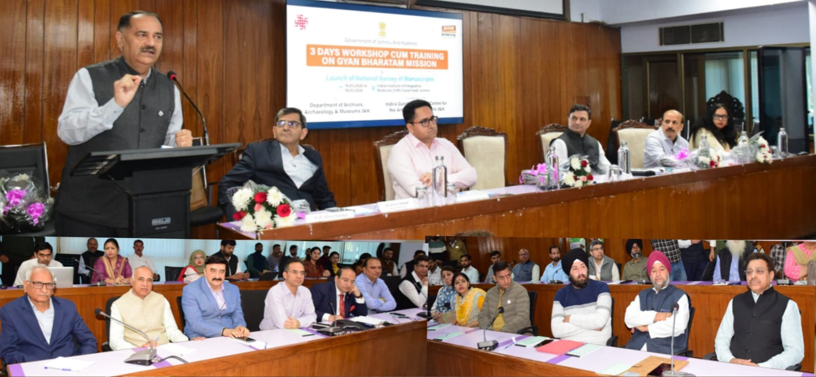 Early Times Report JAMMU, Mar 16: The Department of Archives, Archaeology & Museums in collaboration with Indira Gandhi National Centre for Arts (IGNCA), Regional Centre J&K, today organised a 3 day workshop-cum-Training program on 'GYAN BHARATAM MISSION' and launch of National Survey of Manuscripts at Indian Institute of Integrative Medicine (IIIM), Canal Road Jammu. Principal Secretary, Culture Department, Brij Mohan Sharma, highlighted various aspects of implementation of the central sponsored flagship programme besides importance of this awareness cum training programme regarding survey and conservation of manuscripts. The Principal Secretary said that this Government of India's flagship programme was launched by the Prime Minister, Narendra Modi in September 2025 at an International Conference in Delhi. The program aims to identify, catalogue and digitize approximately one crore manuscripts across the country and conserve them using scientific technology, making the documents accessible in the public domain for scholars worldwide. He observed that around 35,000 manuscripts have been identified in Jammu and Kashmir, with cataloguing complete. Besides, digitization is underway at private institutions and Kashmir University's Persian Department, accelerated by a Government of India cluster centre. Director, Archives, Archeology and Museum, Kuldeep Krishan Sidha highlighted the objectives of launching of GYAN Bharatam and National Manuscripts Survey. He also elucidated the key activities including conservation, capacity building, technology and digitization, linguistic and translation, research, publication and awareness. He highlighted various other aspects regarding National Manuscripts Survey, scope of the Survey, organisational support, survey execution process, role of responsibility, ethical guidelines, monitoring and other important aspects of the programme. Dr Jahagir Iqbal, HOD and Cluster Head Gyan Bharatam Mission, Department of Persian, Kashmir University, gave comprehensive detail about the roadmap to the concerned officers and participants about how to collect the information about Manuscripts and its conservation during surveys in their respective areas. Coordinator, Regional Cluster Centre, Gyan Bharatam Shashvat Art Gallery, Museum and Manuscript Library, Upper Bazar Jammu, Dr Suresh Abrol, also spoke and encouraged the participants about the working in the field of survey and conservation, documentation and digitization of Manuscripts under Gyan Bharatam Mission. Professor and Head (Conservation), IGNCA, Professor Achal Pandya, also gave a PowerPoint Presentation regarding how to collect manuscripts and its conservation and gave awareness on other aspects of the survey program. The participants raised and highlighted queries about different aspects of the survey program. Among others, Assistant Professor Dr Satyender Kumari, IGNCA; Project Managers, IGNCA, Jitendra Chauhan and Dr Nitin Kumar; Deputy Director, Archive, Archaeology and Museum, Dr Sangeeta Sharma besides senior officers of concerned departments and other stakeholders were present in the program. |