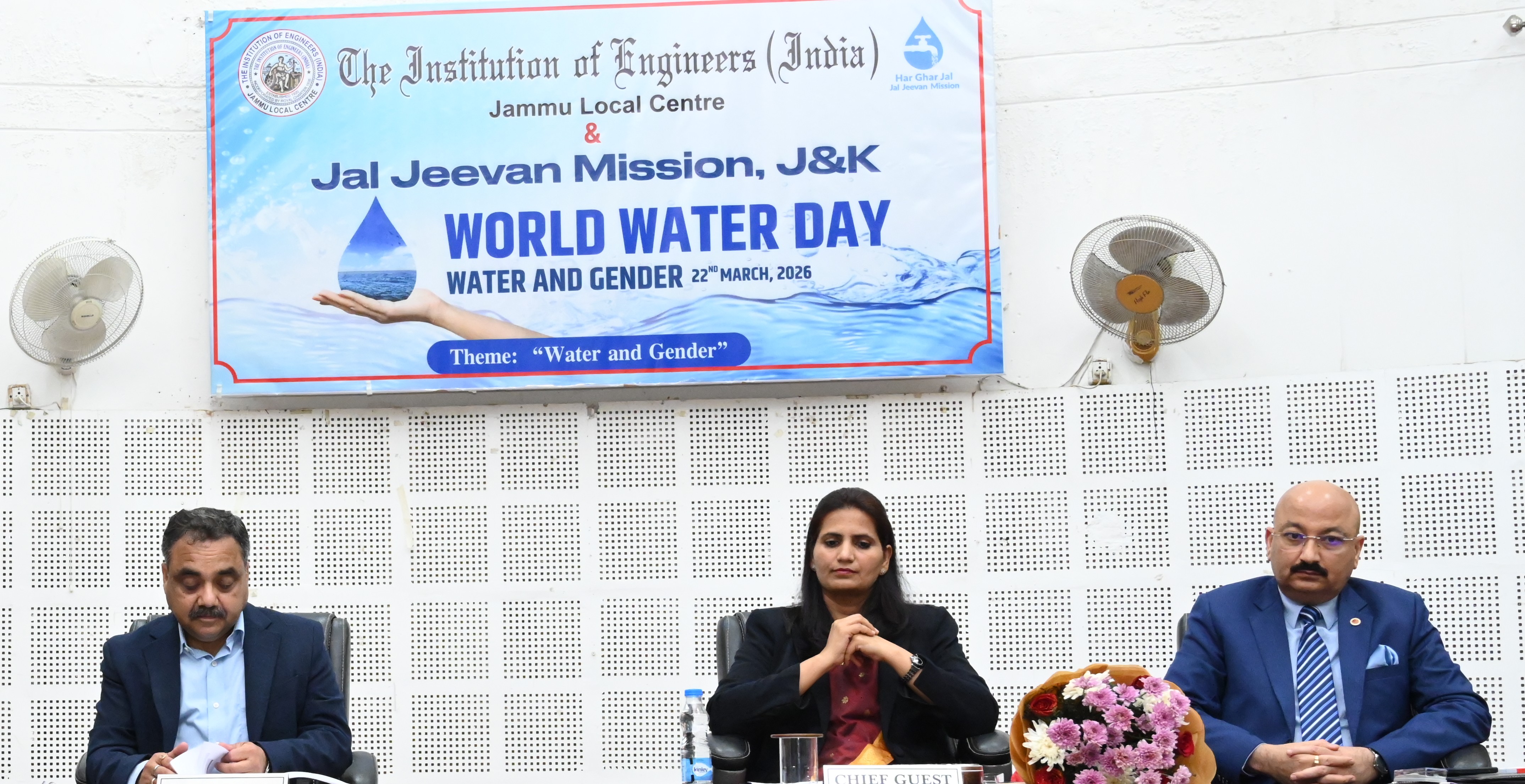 Jammu, Mar 22: The Institution of Engineers (India), Jammu Centre in collaboration with Jal Jeevan Mission, Jal Shakti Department, UT of J&K celebrated World Water Day on 22nd March, 2026 with the theme “Water and Gender”. The event was attended by Engineers from various Departments, Organizations and Senior Engineers along with Members of the Committee of IEI, Jammu Centre. On this occasion, Ms. Anjali Sehrawat, IAS, Mission Director, Jal Jeevan Mission, Department of Jal Shakti, J&K Govt. was the Chief Guest and Er. Anil Verma, FIE Chairman, IEI, Jammu Centre presided over the function. Er. Avneet Gupta, MIE, Honorary Secretary, IEI Jammu Local Centre while declaring the seminar open, highlighted the importance of World Water Day with special reference to theme of this year. [Er. Anil Verma, FIE in his Welcome Address highlighted the importance of this year’s theme and hailed the commendable role played by Jal Jeevan Mission & Jal Shakti Department in covering 15-16 lakh of the rural households upto 2025-2026 for providing water supply. He also informed that efforts of JJM have not only made J&K as fastest improving UT in rural water supply but also have improved the quality of life of women. It has resulted in making the Women folk more safe, secure & stress free from physical strain & other risks by virtue of easing of their burden of water collection from community collection points etc earlier. It was followed by a lecture on the achievements of Jal Jeevan Mission in J&K by Er. Reyaz Bhat, S.E. (Hydraulics) & Technical Advisor to Mission Director, Jal Jeevan Mission, J&K Govt. He highlighted the achievement of Jal Shakti Department & Jal Jeevan Mission with providing interesting statistics. Later 04 Nos speakers namely Er. B. L. Rawal, FIE; Er. Gopal Sharma, MIE; Er. Ranjeev Sawhney, MIE & Er. Joy Ganjoo, AM Technologist presented papers on the theme of this year. Ms. Anjali Sehrawat, IAS, Chief Guest was quite appreciative about the efforts of the speakers for bringing such literature before the audience. She also lauded the Institution of Engineers (India), Jammu Centre for organising the event jointly marking the conclusion of Jal Mahotsav which started on 8th of March.