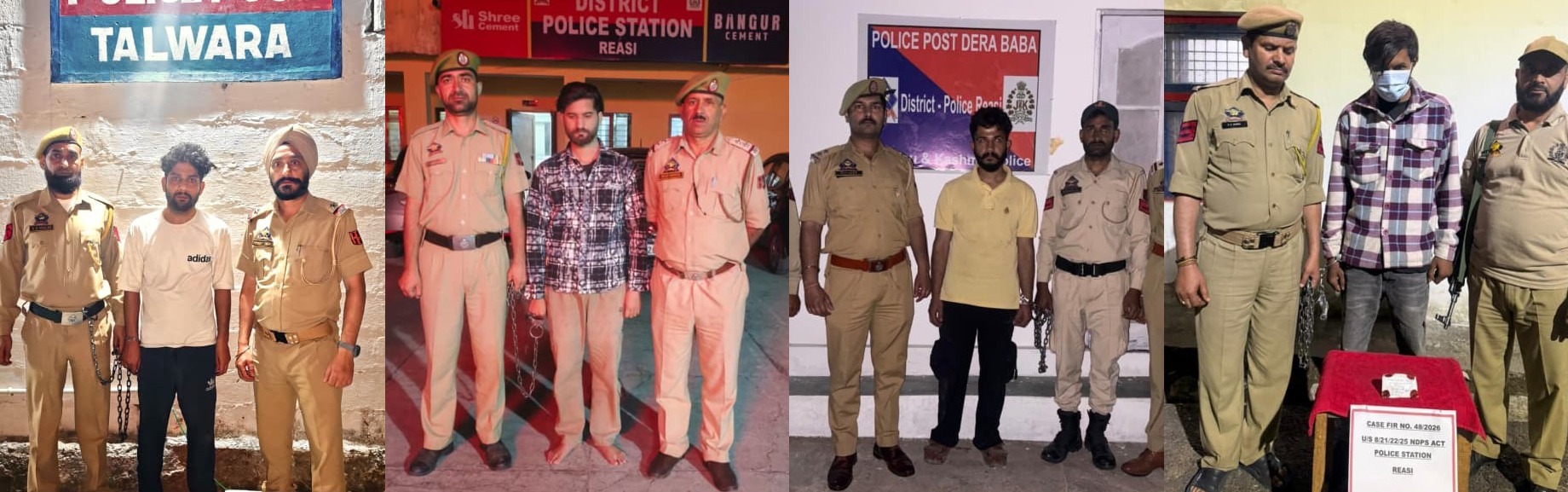 | Major crackdown on narcotics: Reasi police register four NDPS cases, four drug peddlers arrested | | | Early Times Report REASI, Mar 30: In a major offensive a tion against drug trafficking, District Police Reasi has achieved significant success with four back-to-back recoveries of heroin and registration of four FIRs under the NDPS Act at Police Station Reasi. Displaying exceptional vigilance and operational efficiency, Police Station reasi achieved a major breakthrough in the ongoing drive against drug trafficking. Acting with alertness and precision, four teams were created who successfully apprehended four drug peddlers from different locations and recovered significant quantities of contraband substances. The details of the cases are as follows: Case 1 On 29.03.2026, a team of Police Station Reasi during naka checking near IRP Chowk apprehended: Accused: Pushpinder Singh @ Badar S/O Janak Singh R/O Geeta Nagar, Reasi Recovery: 5.10 grams of heroin (chitta)-like substance FIR Registered: No. 47/2026 U/S 8/21/22 NDPS Act at P/S Reasi Case 2 A police party of Police Post Talwara, during naka duty on Baradari Bridge-Reasi link road, intercepted: Accused: Sudarshan Singh S/O Sundar Singh @ Vishal R/O Palapadi, Reasi (A/P Trintha) Recovery: 6.730 grams of heroin-like substance FIR Registered: No. 50/2026 U/S 8/21/22 NDPS Act at PS Reasi Case 3 A naka laid by Police Post Dera Baba near Krishi Vigyan Kendra led to the apprehension of: Accused: Manik Thakur S/o Chain Singh R/o Didi Bhangal, Katra Recovery: 2.55 grams of heroin-like substance FIR Registered: No. 49/2026 U/S 8/21/22 NDPS Act at P/S Reasi Case 4 A team of Police Post Jyotipuram, during naka /patrolling at Kacharyan (Jyotipuram), intercepted a Ford Figo (JK02BD-9558). The driver attempted to flee but was overpowered: Accused: Mohd Hazam S/o Mohd Maqbool R/o Nomal, Tehsil Thakrakote, District Reasi Recovery: 2.77 grams of heroin-like substance FIR Registered: No. 48/2026 U/S 8/21/22/25 NDPS Act at P/S Reasi. Accused has been arrested; further investigation is underway. All the operations were carried out under the leadership of SHO Police Station Reasi, Insp. Khyatimaan Khajuria, under the overall supervision of Dy.SP Hqrs. ReasiVishal Singh jamwal and Addl. SP Reasi Iftkhar Ahmed-JKPS. SSP Reasi Paramvir Singh - JKPS, appreciated the proactive efforts of all police teams, reiterating that Reasi Police is committed to a zero-tolerance policy against drugs. He urged citizens, especially the youth, to stay away from narcotics and encouraged the public to share information about drug peddling to help cleanse society of this menace. District Police Reasi remains steadfast in its mission to make the district drug-free. |