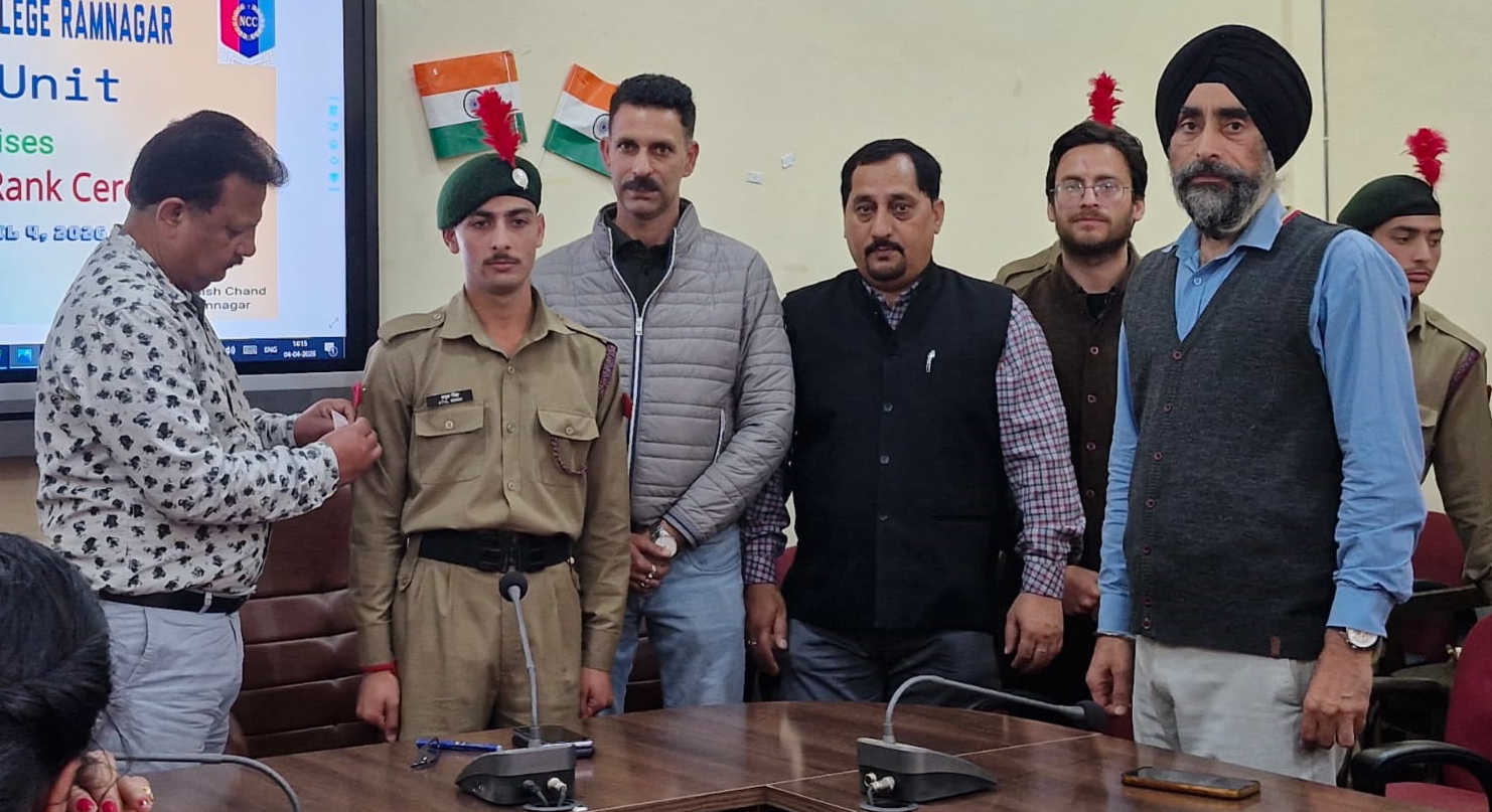 Early Times Report RAMNAGAR, Apr 4: The NCC Unit of Government Degree College (GDC) Ramnagar organised a felicitation ceremony to honour senior NCC cadets for their exemplary contributions, along with a formal Rank Ceremony for newly appointed cadets. The event was conducted under the guidance of Prof. (Dr.) Bhavnaish Chand, Principal, GDC Ramnagar. The programme commenced with a warm Welcome Address by Lt. Dr. Puyesh Kant Sharma, Associate NCC Officer (ANO), GDC Ramnagar, who highlighted the significance of discipline, leadership, and service in NCC training. During the Rank Ceremony, the following cadets were decorated with new ranks for their outstanding performance and leadership potential: Cadet Nitin Kumar - Senior Under Officer (SUO) Cadet Kamesh Khajuria - Under Officer (UO) Cadet Arun Singh - Sergeant Cadet Atul Singh - Corporal The programme also honoured senior NCC cadets for their remarkable achievements and dedication: -SUO Rishav Bandral, felicitated for carrying out NCC responsibilities with sincerity and commitment. -UO Rahul Kumar, recognised for his participation in the Thal Sainik Camp (TSC) 2025. -Cadet Suryavansh Jamwal, honoured for representing the institution at the Republic Day Parade Camp (RDPC) 2026. Addressing the gathering, Prof. (Dr.) Bhavnaish Chand, Principal, GDC Ramnagar, delivered an insightful and inspiring speech on the vital role of NCC in shaping disciplined, responsible, and service-oriented youth. He appreciated the efforts of the ANO, cadets, and the entire NCC wing for maintaining high standards of training and performance. The event concluded with a heartfelt Vote of Thanks by Prof. Eisha Gohil, who expressed gratitude to the NCC Advisory Committee, faculty members, and all participants for making the programme a success. |