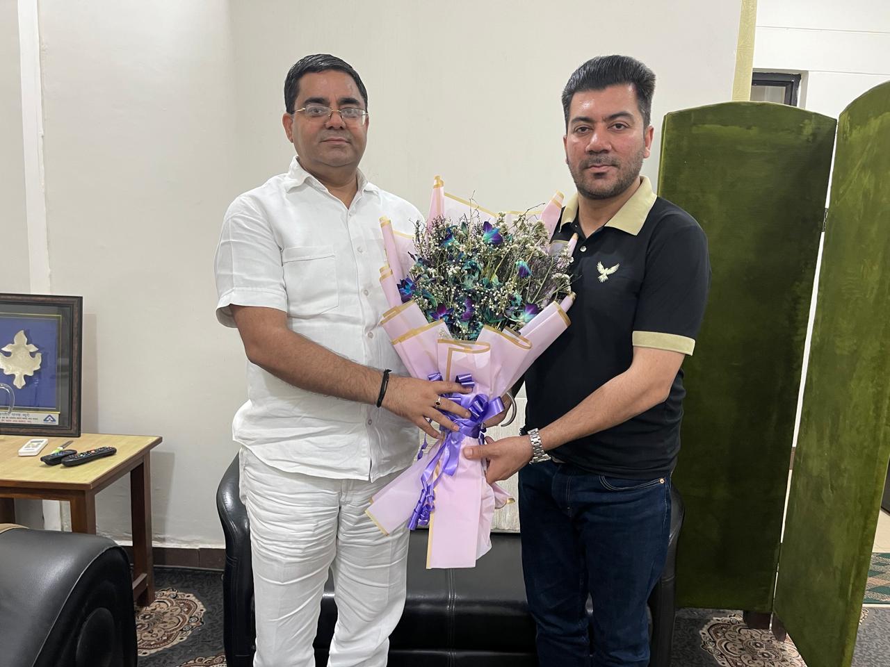 | Abhinav Anand meets Director FCS&CA, extends congratulations | | | Early Times Report JAMMU, Apr 20: Abhinav Anand, President of the Traders Association Trikuta Nagar, Jammu, and Co-Convenor of the Trade Cell, BJP J&K, called on Director, Food, Civil Supplies and Consumer Affairs, Rajesh Kumar Shavan (JKAS), during a courtesy meeting. On the occasion, Anand extended his heartfelt congratulations and best wishes to Shavan. He appreciated his exemplary administrative record and acknowledged the commendable work carried out by him during his previous postings at various places. Anand expressed confidence that under Shavan's leadership, the department will continue to function efficiently and serve the public with dedication and transparency. He further conveyed that the trading community looks forward to continued cooperation and progressive initiatives for the welfare of both traders and consumers. The meeting concluded on a positive note, with mutual assurance of support and coordination in addressing public and trade-related concerns. |