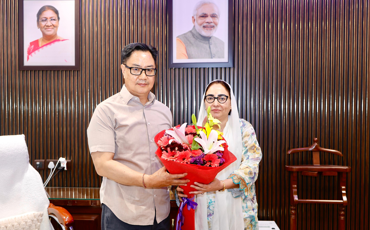 | Dr Andrabi meets Union Minority Affairs Minister Kiren Rijiju at New Delhi | | | Early Times Report NEW DELHI, Apr 21: Jammu & Kashmir Waqf Board Chairperson Dr Syed Darakhshan Andrabi today called upon Union Minister for Minority Affairs Kiren Rijiju at New Delhi and discussed at length the transformative initiatives of the Board and the future roadmap. Waqf Chairperson submitted a detailed report of the achievements of the Board during the last financial year and shared the roadmap for future plans and programmes to be taken up during this fiscal year. Waqf Chairperson highlighted the historic changes and significant projects of the Board which transformed the whole Waqf management structure within J&K, making it the leading Board throughout the country. Union Minister appreciated the work done by the Board and termed it a model system for whole of India. Kiren Rijiju congratulated Dr Andrabi for her visionary projects and bold decision making. He assured complete support from the Union Ministry to J&K Waqf Board in its future projects and initiatives. |