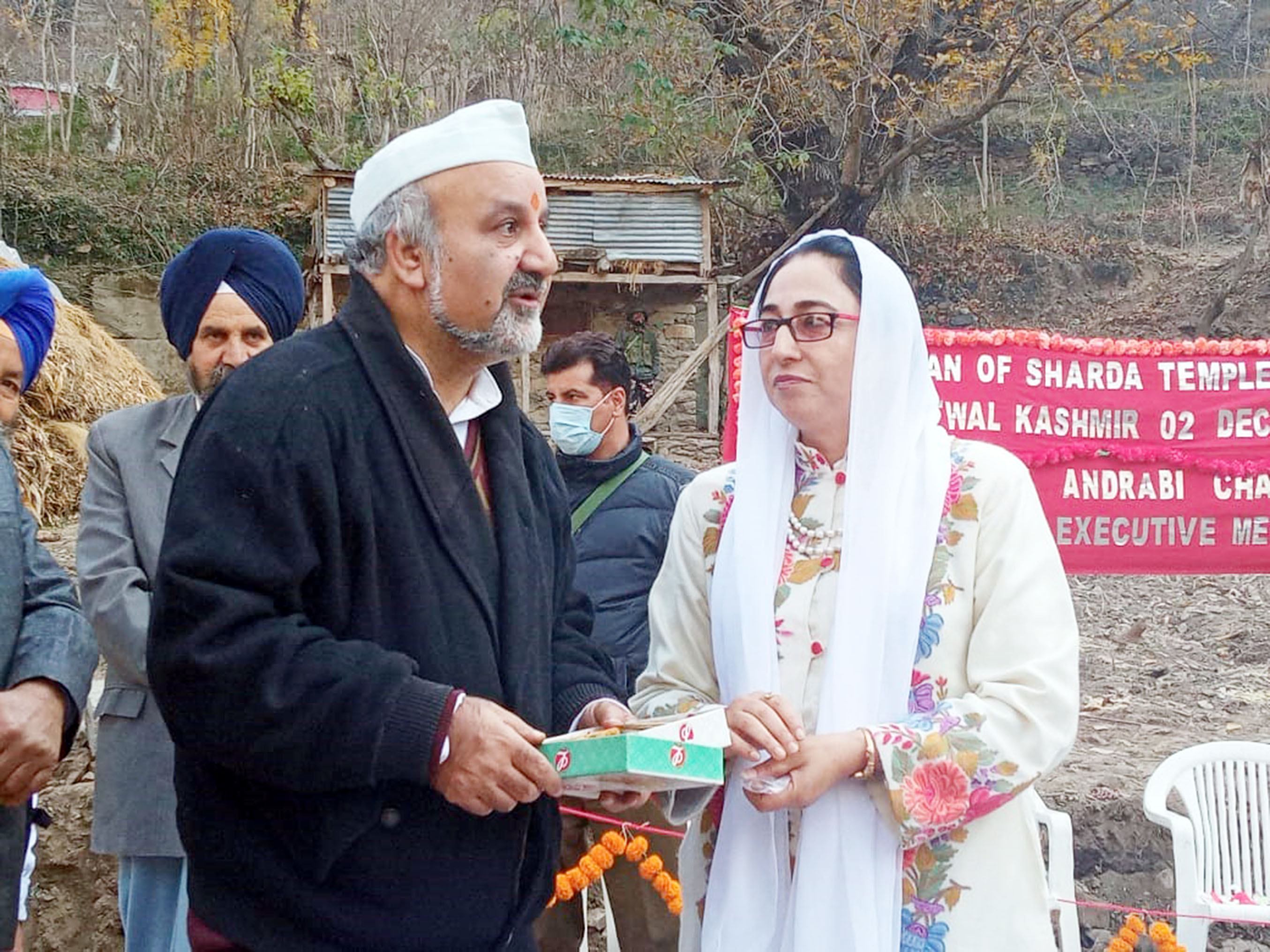JAMMU, Dec 2: Sharda Yatra Committee today organized a foundation laying ceremony of Sharda Centre & Sharda Worship site at Teetwal near Line of Control in Tanghdar Sector. The foundation laying was done by Chairperson of Waqf Development Committee of Ministry of Minority Affairs and BJP National Executive Member Dr Darakhshan Andrabi today in presence of Sharda Yatra Committee Chairman Ravinder Pandita, SDM Tangdhar & Tahsildar Tangdhar. Senior government officials and senior citizens of the area were present on the occasion. This site was reclaimed by the committee at the place where an ancient Dharamshala used to exist up to 1948. This was the last halt-site en-route Sharda Tirtha for the pilgrims from Kashmir & Jammu till 1948. This site was deserted after 1948 tribal attack of Pakistan and now Sharda Yatra Committee under the leadership of Ravinder Pandita after a long struggle retrieved the land and today Dr Darakhshan Andrabi laid the foundation stone for this historical re-construction of huge Sharda Centre & Worship Kendra on the site. Earlier Sharda Yatra Committee had concluded the Bhoomi-Pujan of the land in the morning. Speaking on the occasion Dr Darakhshan Andrabi while addressing the gathering said that Sharda Peetha was the identity of Kashmir for centuries as this was a place of prominence in learning, research & spirituality celebrated throughout south-Asia. Speaking on the occasion Chairman of Sharda Tirtha Committee Ravinder Pandita said that his decades long struggle had bore its fruit today and a beginning to revive the Sharda Culture in Kashmir has been made. “I am grateful to J&K government and Indian Army for their support in organizing the event. Local Muslim & Sikh representatives also stood by us during the struggle & at the event,” said Ravinder Pandita.