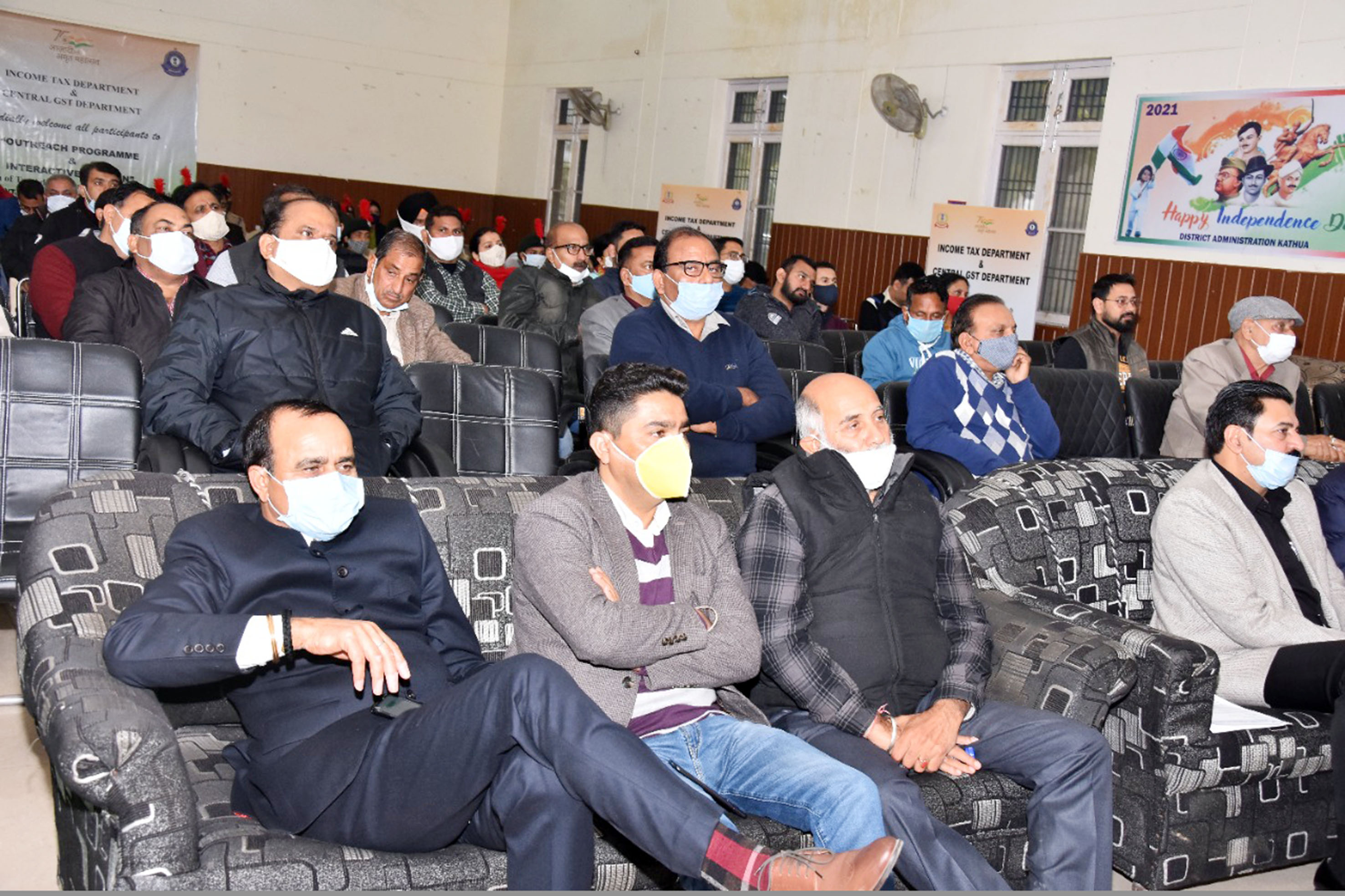 KATHUA, Dec 2: The Income Tax (IT) Department and Central GST (CGST) Department organized an “Outreach Programme & Interactive Session” at Auditorium, Degree College for Women, Kathua to reveal the suggestions, feedback opinions and aspirations of the people of Kathua from the forthcoming Union Budget. The interaction program was organized to make the public aware about the various technological and other initiatives taken by the Department to increase transparency and ease of compliance and to provide better taxpayer’s services. The outreach programme & Interactive Session was attended by representatives of the Traders & Industries Association, Vyapar Mandal, Brick Kiln Manufacturer Association Chamber of Traders Federation, Kathua, Members of NIRC of ICAI, Tax Bar Association and Assessees/DDOs and NCC cadets and students from college besides Pr Commissioner of CGST, Jammu Mahesh Kumar Rustogi, Deputy Commissioner of Income Tax, Jammu Rahul Padha, Deputy Commissioner of CGST, Samba Dr Sandeep Kour, Income Tax Officers MB Raizada, ITO, Kathua, PS Jamwal, ITO TDS and Namit Chaturvedi, Supdtt. CGST, Kathua and other officers from Income Tax & CGST Department at Kathua. MB Raizada, Income Tax Officer, Kathua presented the key note making the audience aware of the mandate of the interaction. Raizada intimated that the technology change and ease of business lead to the change of role of Tax Payer from Tax Enforcer to Tax Facilitator. The various facilities available in the Aayakar Sewa Kendra at Income Tax Office, Kathua were enumerated to the audience for facilitation and redressal of their grievances/issues. Mahesh Kumar Rustogi Principal Commissioner CGST Jammu welcomed all the participants on behalf of CBIC. He emphasized on the Atam Nirbhar, Make In India, Digital India and Swachhata Mission. Explaining the GST as a major reform to mitigate the cascading effects of various taxes such as state and central taxes (C. Ex. Duty, ST, VAT, Purchase Tax, Entry Tax Luxury tax etc), he gave a power point presentation on GST. Deputy Commissioner of Income Tax, Jammu Circle, Rahul Padha informed the audience that income tax department has not only made achievements in tax collections but also in the technological advancements made so as to increase transparency in the working and ease of compliance and resulted in better taxpayer's services.