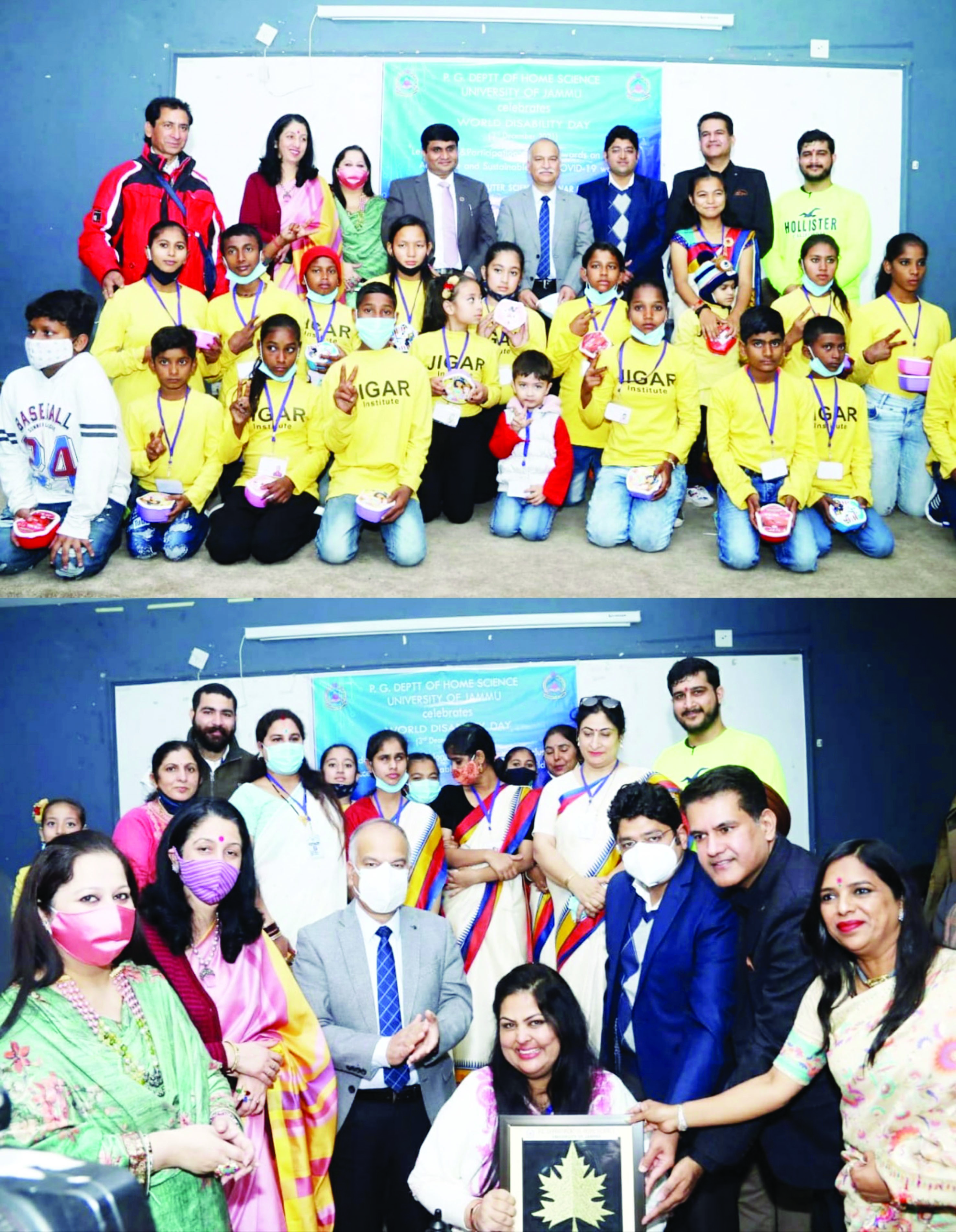 JAMMU, Dec 3: Department of Home Science, University of Jammu in collaboration with Jiger Institute of General Education and Rehabilitation, the Association of Deaf and Aphasic, and Kalpana Kala Kendra today organised a mega event to mark World Disability Day here on the University campus. Divisional Commissioner Jammu, Dr Raghav Langer was the Chief Guest, while Prof. Manoj Dhar, Vice Chancellor, University of Jammu, presided over the event. Speaking on the occasion, Dr. Langer mentioned that a Composite Regional Centre (CRC) is being set up in Jammu to aid the cause of persons with special needs. He said that a land measuring 38 kanal has been identified at Vijaypur for the project. He said that the centre will provide skill development training for all round development of differently abled persons. He also underlined that Lieutenant Governor of J&K is very sensitive regarding these issues and directions have been issued from his office to the Deputy Commissioners for conducting Panchayat level survey to identify specially abled persons and their needs/issues so that the same could be resolved. He also appreciated the students, who presented a scintillating cultural programme during the event. In his presidential remarks, VC Jammu University, Prof.Manoj Dhar reiterated the resolve of the University to make it fully accessible for the PwDs. He also underlined the various initiatives taken by the University in this direction. He also appreciated the collaborating NGOs and the Department of Home Science for their continuous drive for fighting for the rights of the disabled community. He announced that an Equal Opportunities Cell shall be set up at the Department of Home Science, to give impetus to making the University disabled friendly. Prof. Samridhi Arora (HOD) Department of Home Science in her introductory address highlighted that the department works for the cause of marginalized and weaker sections of the society especially the persons with disabilities. She offered that certain specific facilities and services available in the department meant for the welfare of disabled can be availed free of cost. Earlier, Dr Sarika Manhas, Associate Professor, Deptt of Home Science, in her welcome address, mentioned that every year 3rd of December is celebrated to promote an understanding of disability issues and mobilize support for the dignity, rights and well being of persons with disabilities. She mentioned that University of Jammu is committed to true community inclusion based upon personal connections, common interests, shared values, and upon ongoing interactions on a regular basis in natural settings, and today’s event is a reflection of this resolve. Jiger President, Sandhya Dhar highlighted the problems faced by disabled in various sectors of society especially in the context of COVID. The theme of this year’s Disability Day is "Leadership and participation of persons with disabilities toward an inclusive, accessible and sustainable post-COVID-19 world’’. She mentioned that there is a need for handholding so that the disabled are included in the mainstream of society. On the occasion a felicitation program was conducted for the persons who are role models for the society. Those felicitated were Archana Devi (orthopedic disability 70%) teacher JRC home for handicapped, Tilak Raj (spinal cord injury 100%) from Rajouri, Jagjit Singh (spinal cord injury 80%) from Poonch employee of police department, Purshotam (spinal cord injury 100%) from Udhampur Social activist & running NGO, Shiv Kumar (spinal cord injury 100%) from Doda, Shivani Misri (visual impairment) B.A LLB, Pardeep Kumar (spinal cord injury 100%) from Jammu, Kalvin Bhatti (paralysis 80%) social worker and recipient of Gandhi Global Family, Irfan Mir (visual impairment 100% by birth) from Pulwama, mountaineer. Raman Gupta, Managing Director PANS & POTS Co- A Corona warrior & Philanthropist and other Corona warriors were felicitated during the program. Arjun Kumar, Sumeet Bhat who served the society during the peak period of the corona pandemic were also honoured. Others who graced the occasion were Rahul Sahai, Chairman, Chamber of Commerce and Industry, Jammu; Dr Neeraj Sharma, Special Secretary to VC, Vijay Puri, Academic Director, Shemford Futuristic School, Dr. Suminder Singh, MD of IDPS School, Jammu, Dr. Atul Hans, Director of IRDS School, Sukanaya Bhan, sign language interpreter presented a formal vote of thanks. Vinish Malik, research scholar, Deptt of Home Science and Kusum Tickoo conducted the proceedings of the event.