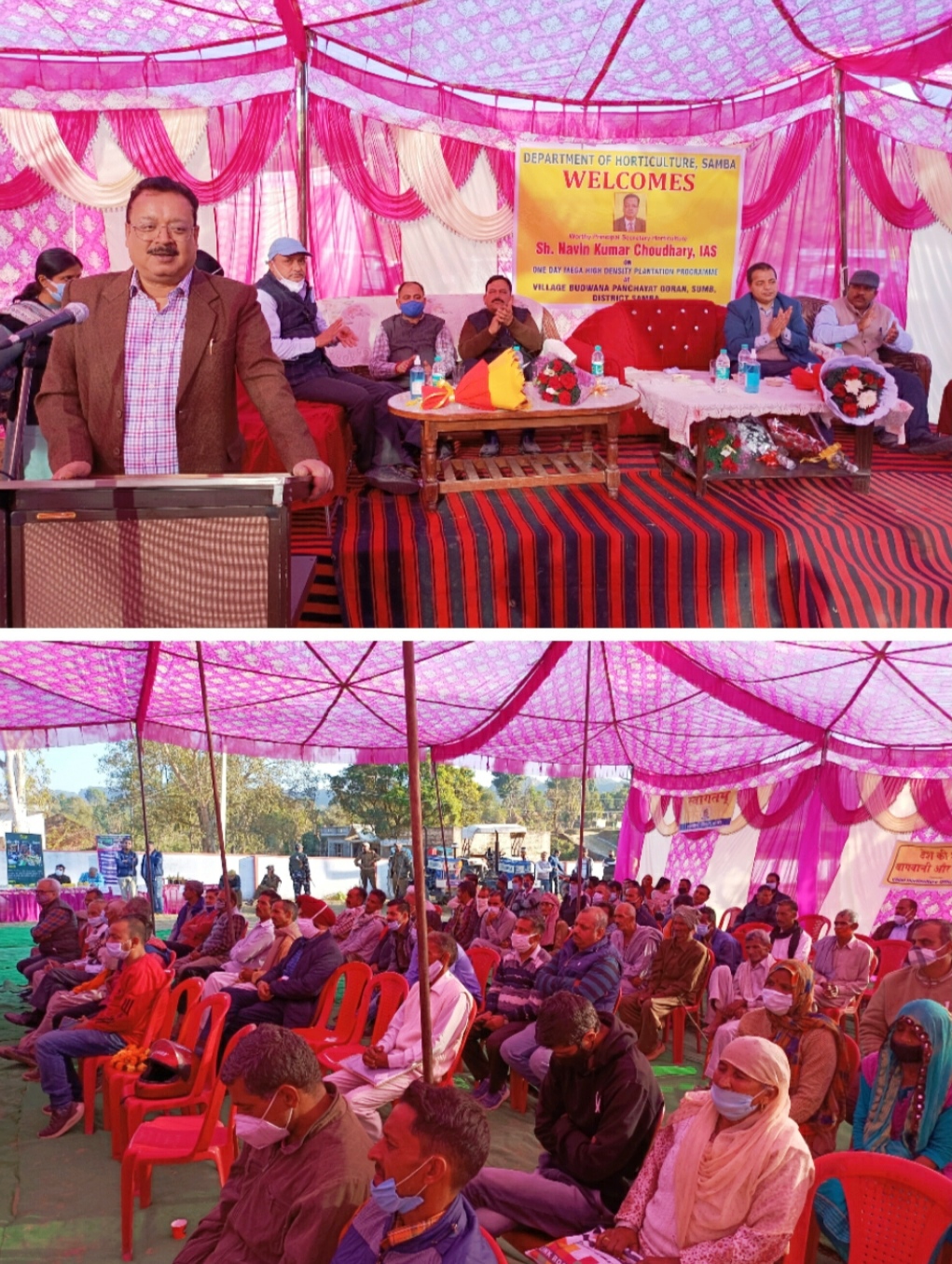 Early Times Report SAMBA, Dec 8: The Department of Horticulture, District Samba today organized a mega awareness camp at remotest village Budhwana of Goran panchayat, in block Sumb, wherein more than 200 farmers of all the horticulture zones of District Samba participated. Principal Secretary to Horticulture, Agriculture Production & Farmers' Welfare Department, J&K Govt, Navin Kumar Choudhary was the chief guest on the occasion. During the programme, the Director Horticulture Jammu Sh. Ram Savak, JKAS, welcomed the Principal Secretary and briefed the chair about the progress being made in respect of plantation and other components of distt. Samba. He said that being a kandi belt, there is a huge potential of fruit crops viz: Aonla, Citrus, Mango and most importantly plantation of Aloe-Vera. While addressing a large gathering of farmers, Navin Kumar Choudhary asked them to adopt the diversification of crops in their fields so that they can earn during the whole year. He said that the camp was organized to generate awareness about various centrally sponsored schemes of the department in general and aloe vera plantation in particular with a motive to enhance the farmer's income. He urged farmers of the area to come forward, avail benefits of different farmer friendly schemes of the department by adopting Horticulture in particular and Dairy farming, Mushroom farming, Honey-bee keeping, pulses and Aloe vera plantation in their fields in place of traditional farming which will help them in doubling the income. Axion Ayurvedas Managing Director, Rishab Gupta while addressing the farmers, assured that they will buy back the Aloe Vera production from which a farmer can earn more in comparison to conventional farming. Later, Navin Kumar Choudhary inaugurated the mega plantation drive in a cluster of 200 kanals by planting saplings of Citrus and Aloe Vera plant at village Budhwana of Goran panchayat in presence of Director Horticulture Jammu, Jt. Director Horticulture Jammu, DDC vice chairman Balwan Singh, BDC Chairman Sumb, Ramesh Singh, Sarpanch Goran Sardar Singh and other officers and farmers. Vote of thanks was presented by Jt. Director Horticulture Jammu, CL Sharma. |