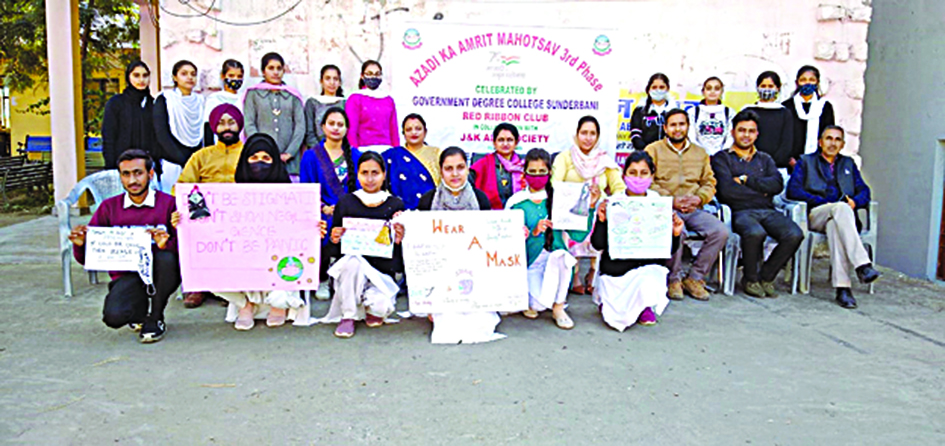 RAJOURI, Dec 8: The Red Ribbon Club of Govt. Degree College (GDC) Sunderbani in collaboration with J&K AIDS control Society organizes mask making-cum-slogan writing competition on Covid-19 under the leadership of Dr. Vandana Gupta, Principal GDC Sunderbani. The program held in college campus in continuation with organization of series of activities during 3rd phase of Azadi ka Amrit Mahotsav on the Eve of 75th Independence Day celebration. In “Mask Making cum Slogan Writing on Covid-19”competition, number of students participated in which Sania Jaral student of 5th Semester, secured 1st position followed by Ansuja Devi and Waseem Akram of Semester 5th ,Disha Sharma and Sonika Sharma of sem 5th sheared 3rd position. The programme was organized by Prof. Sheraz Kousser and Prof Mukesh Sharma, convenor and Co-convener of Red Ribbon Club. Prof. Beant Singh, Prof Sham Lal, Dr Paras Ram were judges for this competition. |
