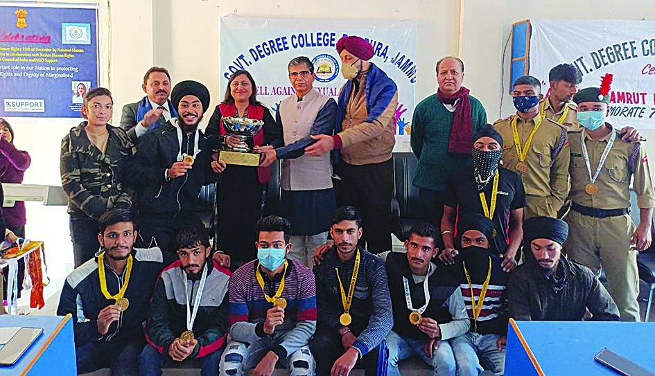 JAMMU, Dec 8: Cell Against Sexual Harassment (CASH Committee) in collaboration with NSS unit of Govt. Degree College RS Pura organized a series of events to celebrate Human Rights Week under the aegis of IQAC and Azadi Ka Amrut Mahotsav. The Session started with an awareness lecture. The resource person of the session was Dr Navneet Kaur, Founder Chairperson NGO SUPPORT and National Chairperson Human Rights Social Justice Council of India. The event started with formal welcome address by Dr. Balwinder Kaur, Convener, CASH Committee. Dr. Navneet Kaur gave a detailed information about the various Human Rights and make the audience aware about the violence prevailing in the society. She emphasized the youth to raise their voice and not to surrender to adverse circumstances. Dr. Navneet Kaur honored the faculty and outstanding students (NSS, NCC and Sports) by giving them Certificates of Appreciation from NGO SUPPORT. She also distributed medals to the winners of Intercollegiate sports tournament. Vipin Nischal made the students aware about the importance of Yoga and performed the laughing exercise for relieving stress in day to day life. Prof. Sunil Uppal, Principal of the college stressed upon educating the youth specially males to change the thinking of the society about the gender discrimination. Gender Champion Club was also inaugurated for the Session 2021-22 by organizing a Signature Campaign in which the resource persons, Principal, Faculty members and students of the college participated. The proceedings of the program were carried out by Prof. Bindu Kumari, NSS Programme Officer whereas Dr. Anuradha, Department of Punjabi presented a formal vote of thanks. The committee members who made this programme a success are Prof. Himanshu Khajuria, Prof. Sandeep Kumari and Dr. R K Santhal.