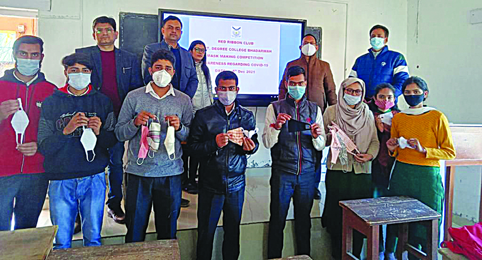 BHADERWAH, Dec 8: The week long programme of Red Ribbon Club of GDC Bhadarwah w.e.f. 1st to 8th December 2021 concluded with the mask making competition in the college. The programme was organized in collaboration with Jammu & Kashmir AIDS Control Society, (JKACS) Department of Health & Medical Education; Govt. of J&K. The event was a Plan of Campaign @75 to celebrate the 75th year of Independence (Azadi Ka Amrit Mahotsav). The event started with the formal welcome address by Dr. Sandeep Kotwal, Nodal officer of the Red Ribbon Club. He asserted that during the pandemic the preventive measure to avoid the spread of COVID-19 was wearing face mask, sanitizing hands, maintaining safe distance and getting vaccinated. He highlighted the importance of face masks to curb the spread of numerous contagious diseases. He also appreciated the participating students for actively participating in awareness generation on HIV, TB, Voluntary Blood donation and COVID-19. Principal of the college Dr. Kuldeep K Sharma, under whose guidance the programme was organized, in his interaction with the students aware them about the latest mutant of Corona-virus named Omicron and the concerns about it globally, including India. He informed them that the only way to be protected about its fast spreading tentacles world-wide is to strictly follow COVID-19 protocols. He admired the organizing team for successfully conducting the week-long programme with full dedication. About twenty five students of the college actively participated in the programme. Danish Ikhlaq of semester 3rd adjudged as winner of the mask making competition whereas Meelan Shapoo and Vishal Bharti of 5th semester secured 2nd and 3rd positions respectively. The event organizing team comprised of Prof Davinder Kumar, Prof Prithvi Raj, Prof Sandesh Kumar and Dr. Sangeeta Devi. |