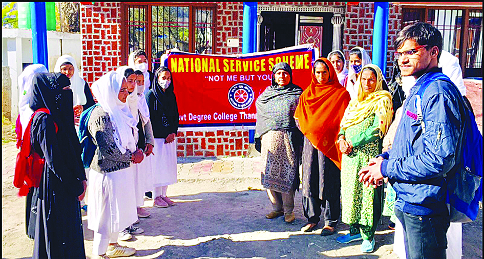 RAJOURI, Dec 10: NSS unit of Govt Degree College (GDC) Thannamandi organized a week long door to door Cleanliness Awareness Campaign implementing Clean India Programme under the aegis of Azadi Ka Amrut Mahotsav. The awareness campaign was carried out from 4th of December 2021 to 10th of December 2021 in village Hasplote Thannamandi Ward No 4. About 45 NSS Volunteers participated in this Awareness campaign related to Solid Waste management, its proper disposal and various other issues related to Clean liness. The whole Programme was conducted under the patronage of Principal of the college Prof. (Dr.) Javaid Ahmed Qazi. The NSS Volunteers motivated the local community people to take part in cleanliness drives organized by Clean India programme. The Prime objective of this programme was to spread awareness among the people regarding cleanliness. The Awareness Campaign was organized by NSS Programme Officer Prof. Muhammad Shoket. |