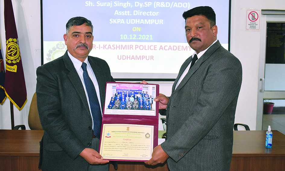 UDHAMPUR, Dec 10: The five days training programme for investigators on “Safety of Women” sponsored by BPR&D New Delhi concluded here at S.K. Police Academy. Speaking on the occasion, Suraj Singh, DySP expressed his gratitude to the BPR&D, New Delhi for providing all necessary assistance for the training programme. He appreciated the efforts of the management team of the academy in organizing the programme. He said this training programme was aimed to enhance and upgrade the investigating skills of J&K police I.O’s in crime against women cases and added that given the magnitude of the problem this training course is of great importance. He hoped that the programme would prove helpful for the officers/IOs in investigating the cases related to safety of women. The course was designed to have a threadbare study of the various kind of offences committed against women in India, role of police in preventing crime against women and to make aware the participants about the laws relating to safety of women. 18 officers of J&K Police attended the training programme. |