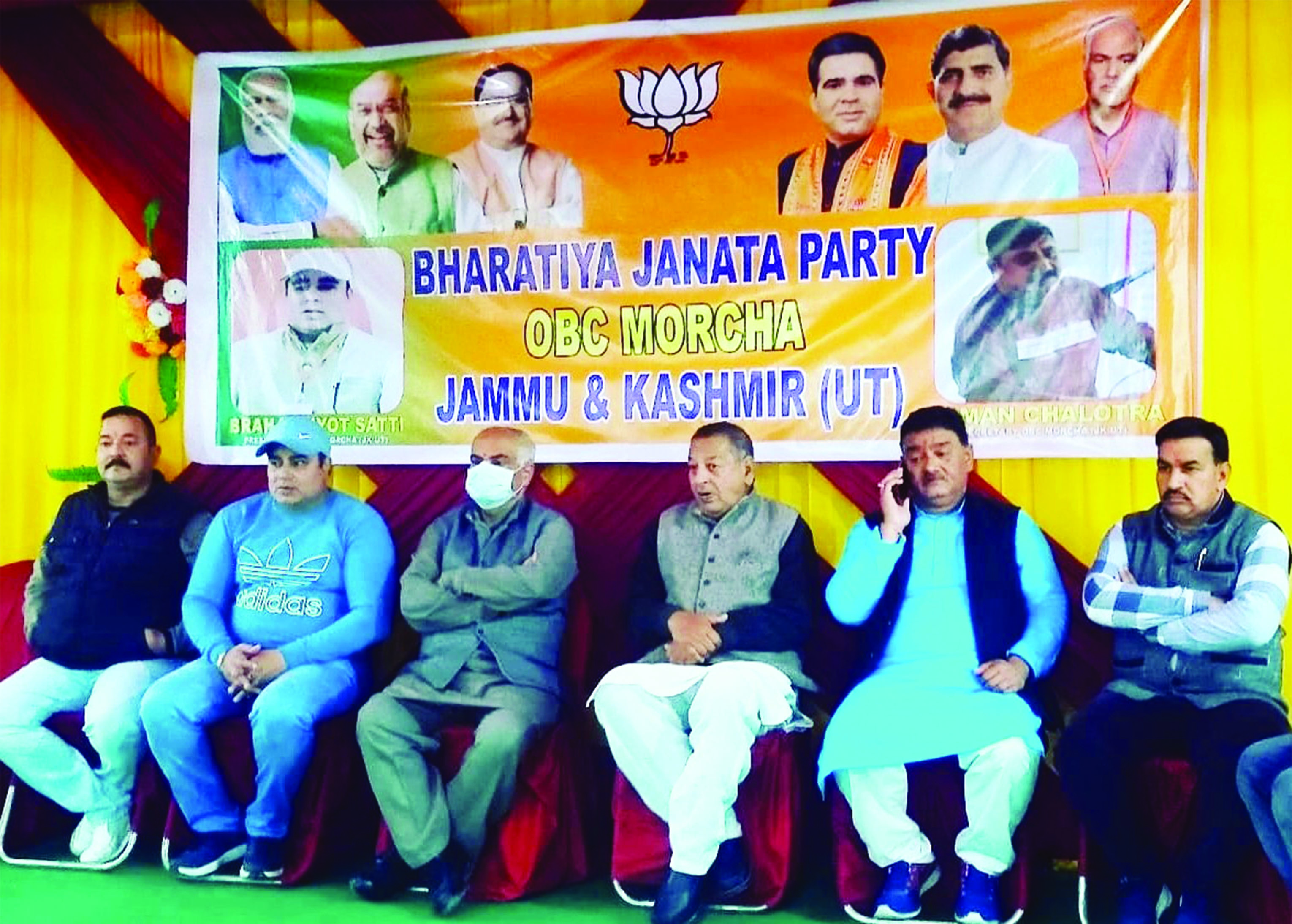 e . Rajinder Singh Chib Praised BJP OBC Morcha for conducting Commendable tasks across Jammu Kashmir and said BJP OBC Morcha has already done huge number of social tasks in Jammu Rural and counting is still going on . He said people are vesting interest in BJP and in upcoming elections BJP will get full mandate . Braham Jyot welcomed and congratulated newly joined members and he appreciated the working Jammu Rural team for doing Commendable tasks . He said BJP always follow Idealogy of Nation's First and this policy is better for India and its Citizens . He also said people are inspiring from working of BJP OBC Morcha and joining BJP . BJP OBC Morcha always available for the well being of public and anyone who is facing problems can contact OBC Morcha District Presidents of respective area. There is huge number of highly beneficial schemes which are running by Government just for needy people and public should take benefit these schemes , He added . Neelam Virdi ( Vice President Obc Morcha JK-UT), Sunil Prajapati ( General Secretary BJP OBC Morcha JK-UT), Raman Chalotra (State Secretary Obc Morcha), Kuldeep Singh Chib (District Vice President, Councillor), Mukesh Sharma (District Vice President Bjp), Suraj Padha (Ex District President, Councillor), Mohinder Bhagat (Councillor), Gurbachan Singh (District President Minority Morcha), Narinder Verma (District Spokes Person Obc Morcha), Parshotam Kumar (District Media Secretary Obc Morcha), Radhika Verma ( Mandal Secretary OBC Morcha), Vishal Mehra (Block President Muthi Paloura Mandal), Manik Kumar (Block General Secretary Obc Morcha), Raj Sharma (District General Secretary Bjym), Dushant Singh (Block President BJYM), Rockey Jamwal (Block General Secretary Bjym) were present on the occasion .