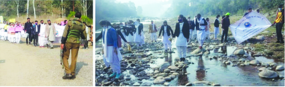 JAMMU, Dec 14: NSS unit of GDC Kalakote in collaboration with Department of Environmental Sciences and EBSB to commemorate Azadi Ka Amrit Mahotsav has organized a seven-day long special winter camp for NSS volunteers of the college under the guidance of the Principal, Dr. Romesh Kr Gupta. The second day of the special camp started with NSS song followed by National Anthem. Dr. Romesh Kr Gupta, Principal of the college addressed the assembly and appraised the volunteers for playing their part in saving the natural resources and become a role model to the society. From there the NSS volunteers went to Chainpur to clean river Tawi accompanied by NSS members of the college. NSS PO Priyanka Kumari boosted NSS volunteers for doing their job as a part of community service by sensitizing the masses by restoring the river quality. The Volunteers carried out this cleanliness drive by cleaning the river side, taking out all the garbage and plastics thereby disposing them off. The slogans related to the theme were displayed by the NSS Volunteers to spread awareness on the necessity of clean water. Rivers are the lifeline of any civilization and polluting it means extinction of the civilization. World is facing water crisis therefore it is the need of hour to save and protect our rivers from any kind of harmful substance and pollutants which affects the quality of water. Principal of the college Dr. Romesh Kr Gupta appreciated the Organizing Committee for initiating such fruitful activities in the college. The students were provided with refreshment in the end. |