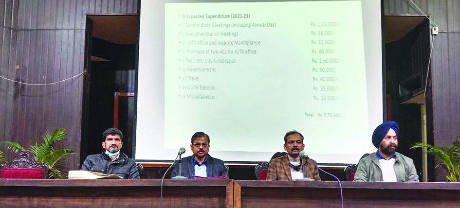 JAMMU, Dec 14: A General Body Meeting of Jammu University Teachers’ Association (JUTA) was held in the Brigadier Rajinder Singh Auditorium, University of Jammu where several issues being faced by the University teachers were discussed. The teachers raised objections to the fact that they are getting 5.1% rate of interest for their GP Fund whereas the state government employees are getting 7.1%. Prof Pankaj Srivastava, President of the Association, assured the house that every possible step will be taken by the association so that the rate of interest for GP Fund of the teachers be raised from 5.1% to 7.1%. It was also resolved unanimously that the promotion of Assistant Professors from lower to the higher stage be done as per the UGC guideline i.e. without the personal appearance of the candidate. It was impressed upon by the members of JUTA that all the process with regard to the promotions of teachers be completed in a time bound manner under UGC regulations. It was resolved that the President and his team will put pressure on the administration to clear all the pending cases for promotion under career advancement scheme as soon as possible ‘zero pendency’ will be achieved within six months. The matter related to the health insurance of the teachers was also on priority and various options were explored in this regards. The accumulation of earned leave for 300 days and enhancement of superannuation age for University Teachers to 65 years as per UGC statutes was also discussed in the meeting. The house suggested that the matters related to teachers be presented before the office of Lieutenant General, Manoj Sinha, the Chancellor of the University, for early redressal. The meeting was conducted by Dr Ravinder Singh, Department of English, General Secretary of JUTA and the vote of thanks was presented by Dr Manoj Bhatt, Department of Economics who is the Vice-President of the Association. The joint secretary, JUTA Dr Yudhvir Singh from the Department of Geology and Dr Sushanta Panda, Treasurer, JUTA from the Department of Education were also present in the meeting. |