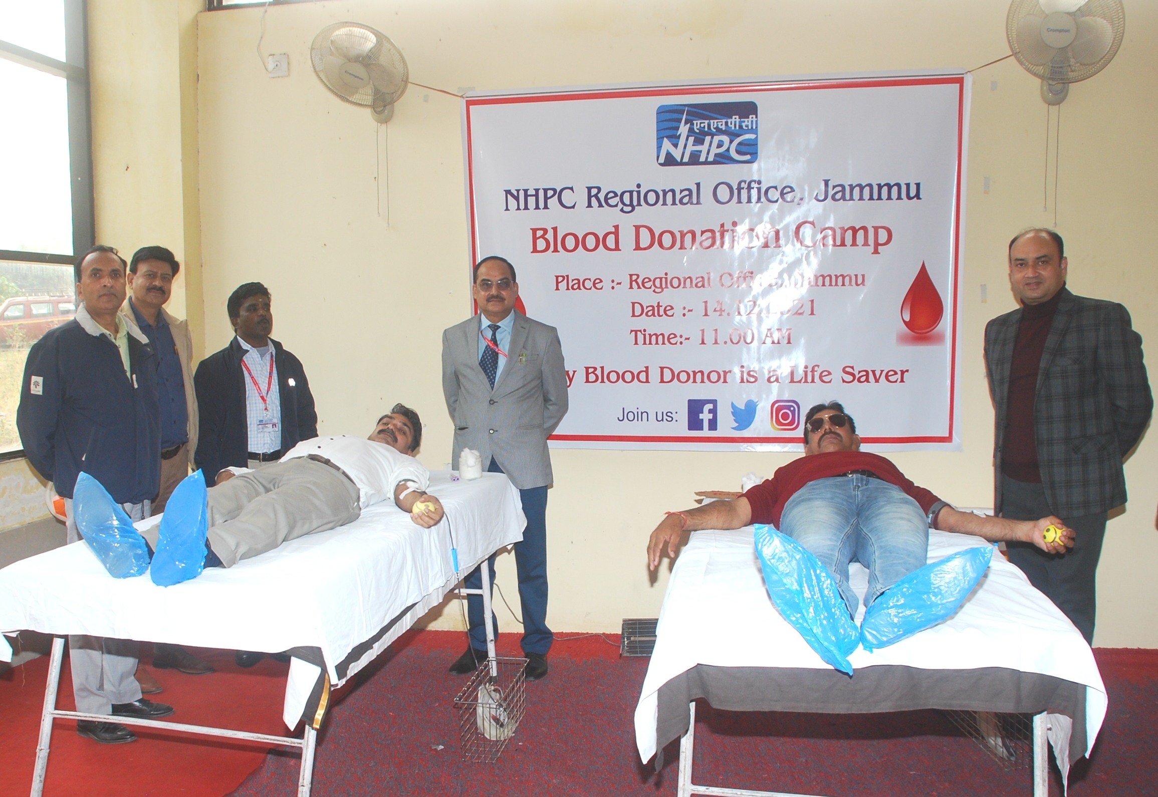 JAMMU, Dec 14: A blood donation camp was organized in NHPC Office Complex, Jammu today under "Azadi Ka Amrit Mahotsav". This camp was organized in collaboration with Govt. Medical college Jammu. NHPC employees, CISF jawans and persons from other departments/ organizations voluntarily donated blood on this occasion. Dr. Niti Dutt and her medical team from GMC in association with NHPC RO Medical team headed by Dr R.S Rathi, CMO conducted this blood donation camp wherein a total of 45 unit blood was collected. Rajan Kumar, Executive Director, NHPC Regional Office, Jammu formally inaugurated the blood Camp in the office premises. On the occasion, he said that blood donation is a virtuous act and in the prevailing scenario it is the best contribution one can make to society. To organize blood donation camps under Azadi Ka Amrit Mahotsav a meaningful effort can be made to fulfill our social obligations. He said that the organizing of blood donation camps at various locations of NHPC shows the proactive attitude of our CMD A.K Singh towards humanity and commitment to the society. S.K Jana, GM (F), P Sathyamurthi, GM (HR), Dr R.S Rathi, CMO and other senior officers, Employees & medical staff were also present on the occasion. |