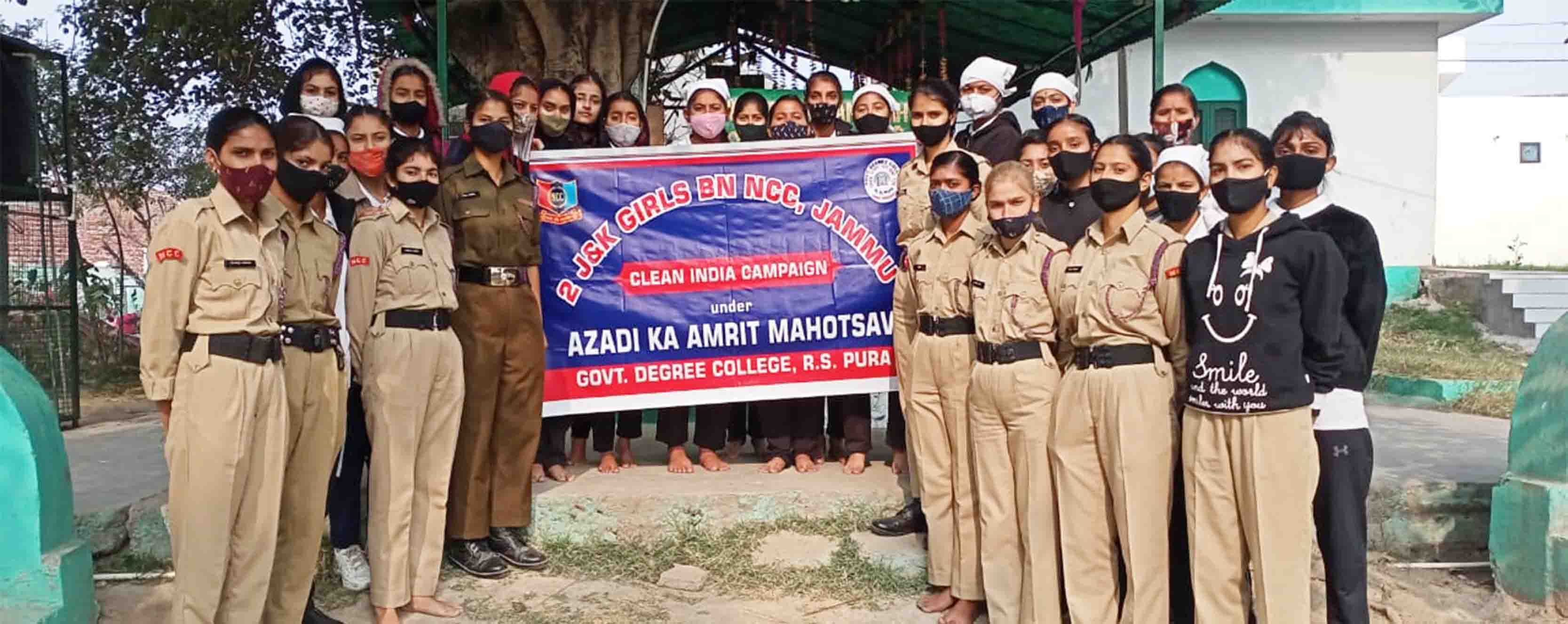 R S PURA, Dec 16: Department of Environmental Sciences, Government Degree College, R S Pura in collaboration with 2 J&K Girls BN NCC of the College organized a cleanliness drive in Peer Baba Parvan Shah Ji located in village Chohala as part of ‘Clean India Programme’ under the aegis of ‘Azadi ka Amrit Mahotsav’. The activity was conducted under the patronship of Prof. Sunil Uppal, pPrincipal of the college and supervision of Prof. Esha Abrol, HOD, Environmental Sciences and Lt. Shaveta Choudhary, NCC ANO. 33 students participated in the drive wherein they cleaned the premises and vicinity of the Peer Baba.