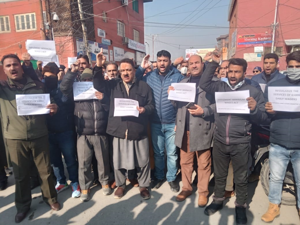 | EJAC holds protest demonstration, seeks regularization of daily wagers | | | Early Times Report SRINAGAR, Dec 16: JK Employees Joint Action Committee (EJAC) held a strong demonstration in Press Enclave at Srinagar demanding regularization of daily wagers, adhoc and temporary employees working in different departments of JK for last two decades. Led by President EJAC, Mohd Rafique Rather EJAC and Gen Secretary Sajad Parray, leaders along scores of EJAC activists holding play cards in their hands with slogans in favour of regularization of daily wagers, adhoc and temporary employees, raised slogans in favour of their demands of regularization policy and minimum wages Act. While speaking with the press, President EJAC Mohd Rafiqur Rather said that regularization issue of adhoc, temporary and daily wagers is a human issue which government need to address on priority. He said that regularization of big chunk of such employees is a geniune and legitimate issue which has been agreed and accepted by respective governments but its strange that nothing in this regard has been done so for. He said that these employees have been performing their duties in extremely tough conditions and have always been standing shoulder to shoulder with other regularized employees but still they are paid a meager pay that too after even months. Rather said that government has left these employees to starvation and has made their families to suffer, with the result their wards do not receive proper education and elderly people suffer for want of proper medication. He further stressed upon the government to implement minimum wages act as per the Supreme Court ruling till the regularization policy is announced. President EJAC expressed surprise on the attitude of government and said that no seriousness is shown by the government towards these genuine demands. Rather said that he has handed over a memorandum to chief secretary and almost all advisors of the government in this regard but nothing concrete has come out so for. He said that if such an attitude continues to be witnessed from the government, EJAC will be left with no option but to hit the streets. Flanked by Sr EJAC leaders Wajahat Durani, Farooq Khan, Nazir Ahmad Khan, Mushtaq Ahmad, Fayaz Ahmad Agri and scores of other EJAC leaders and activists, he said that protests will continue till demands are accepted and added that EJAC will not rest until justice is delivered to these poor employees. He appealed LG and Chief Secretary to formulate a comprehensive regularization policy in favour of these employees so that they too live a dignified life. |