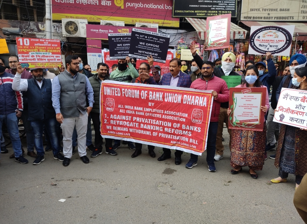 Early Times Report JAMMU, Dec 16: A massive demonstration of bank employees was held at Shalamar Road in front of Punjab National Bank today, under the banner of United Forum of Bank Unions (UFBU) since there was no positive development in the conciliation meeting. It has been decided to go ahead with a two-day long strike starting today to oppose privatization of public sector banks. The demonstration was addressed by Arun Kumar Gupta, General Secretary Jammu Province Bank Employees Federation who informed the gathering that the reason for two days continuous nationwide bank strike by one million bank employees against the government decision of privatization of two public sector banks as well as bringing Banking Amendment Law Bill in this session of Parliament. Com Gupta said that there is a wrong perception and mistaken information that public sector banks are not earning profits and are incurring losses. But the fact is that Public Sector Banks are earning huge operating profits. Instead of further strengthening public sector banking, the present policies are aimed to weaken PSBs, by starving them of the required capital, human resources, allowing private hands through disinvestment and proposed privatization moves. Weakening our Public Sector Banks is unwarranted, unjustified and is a regressive step, he added. Com Ashwani Pradhan, General Secretary, AIBOA (J&K Chapter) also addressed and demanded strengthening of public sector banks by adequate infusion of capital, human resources and strengthened statutory framework to recover the stressed assets. Today bank employees strike is grand success in entire J&K and tomorrow will also be a grand success, he added. Those who also addressed the gathering included Comrades Tara Singh, Yogesh Kumar, A.B Khajuria R.K Bamba, Harminder Singh, T.K Tikoo, Ganesh Kumar, Jatinder Kumar, Harbans Lal, Kewal Kumar, Avinash Sharma, Sahil Gupta, R.K Bhat and others. |
