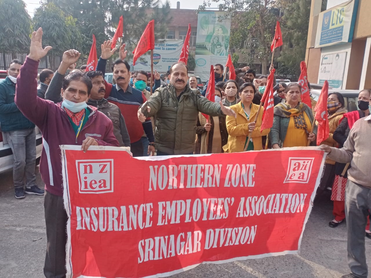 Early Times Report JAMMU, Dec 16: Massive demonstrations were held by LIC employees in LIC offices of Jammu & Kashmir against privatization of public sector banks who are on two days strike 16-17 December 2021. The demonstrations were held under the banner of Northern Zone Insurance Employees' Association Srinagar Division and led by Com. Pawan Gupta Divisional Secretary and Com. A.M Tantray, President of the Association. Speaking on the occasion at D.O Cell Jammu, Com. Pawan Gupta lambasted the NDA Government for its anti people, anti workers, anti farmers policies. He strongly opposed the privatization of public sector banks as the banks has earned an operating profit of Rs/197334/crore for last financial year and contributed a lot in the national development by mobilizing savings of the people. He said that such privatization is not in the interest of the nation, bank employees and customers, adding that see the reward being given to the bank employees, who worked day and night during demonetization, in the form of privatization. Others who spoke Com. Romesh Chand, Joint Secretary, Com. Dinesh Kumar Sharma, Vice President, Com. Rajesh Kumar, Com. Raj Kumar, Com. Neelam Sharma, Women convener besides others. In valley, main speakers were Com. A.M Tantray President, Ajaz Ah Dar, Joint Secretary,Fyaz Gul Vice President, Amarjeet Singh Asst Treasurer, Syed Aadil Imam-Special invitee, Nadeem Ul Rehman, Ishfaq Hussain Bandey and others. Demonstrations were led by Com. Ashwani Sharma in Jammu-1, R.P Singh in Jammu-2, Vijay Verma at Kathua, Kuldeep Singh at Samba, Rajesh Sapolia at R.S Pura, Ram Raj at Doda, Raj Kumar at Poonch, Vinod Sharma at Rajouri, Gulshan Singh Bali at Anantnag, Manzoor Ah Yatoo at Pulwama, Sharief udin Peer at Sopore and Bashir Ah Bhat at Budgam. |