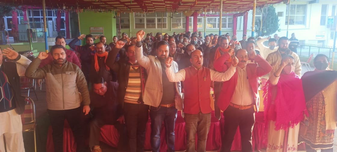 REASI, Dec 16: JK UT Employees United Front (JKUTEUF) organized meeting at Reasi under the leadership of Chairman Bhupinder Singh and attended by large number of employees of the district. Bhupinder appealed LG to resolve three main demands of employees that include regularization policy for daily wagers, home guards, NYCs, REK, REZ, MGNREGA employees, NHM employees, SFC employees, casual labourers, Anganwani workers and other temporary employees, restoration of old pension scheme in favour of employees appointed after 1-1-2010 and implementation of pay grade in favour of employees of J&K at par with other UTs. |