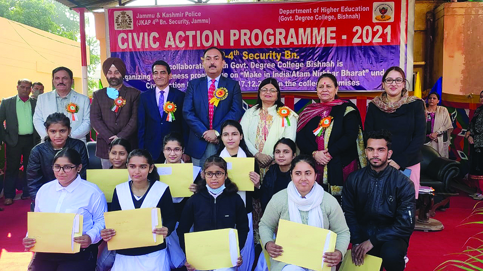 JAMMU, Dec 17: JKAP 4th Security Bn in collaboration with Govt Degree College Bishnah organized an awareness programme on Make in India/Atam Nirbhar Bharat under Civic Action Programma-2021 in the premises of Govt Degree College Bishnah. Dr S.D Singh, ADGP Security, Director SKPA Udhampur, Director SSG was the Chief Guest and Dr Anuradha Pandoh was the guest of honour on the occasion.On arriving at the venue, the chief guest inspected the stalls of Ari work, paper bags, candle making from Police Department and mushroom cultivation installed by Department of Botany, GDC Bishnah. The stalls were installed to make the students aware as to how to become self reliant besides theie studies. The programme started with lighting of the traditional lamp. Dr Anuradha Pandoh formally welcomed the chief guest and other dignitaries present on the occasion. In the symposium having the topic Make in India/Atam Nirbhar Bharat, students threw light on the different contours of Make in India/Atamnirbhar Bharat. Their performances were adjudged by the jury comprising Sanjeev Khajuria, SP JKP, Prof Rashmi Arya, Dr Sapna Bharghav. Anmol from Sem-V got 1st, Mukti from Sem-III 2nd while Ankush from Sem-V and Riya from Sem-I shared the 3rd prize respectively. Prof Amit Kumar Sharma from GDC Bishnah and Dr Bazila Naseer, Consultant, PMFME Deptt of Horticulture, Civil Secretariat also delved on the various aspects of the theme. Speaking on the occasion, Dr S.D Singh Jamwal exhorted the students to be confident of their capabilities and polish them for their development as well as the development of the nation. Ashok Kumar Sharma, SSP, Commandant 4th Security Bn emphasized that India is a nation of youth and hence has immense potential for contribution in realizing the dream of self reliant India through skill development. The participants and speakers were given mementos and cash prizes. The entire programme was compeered by Dr Sunil Kumar Saliada, Prof Sunil Kumar and Sgct Sayeda. Amrit Kour, Principal of GHSS Bishnah along with their staff and students was also present in the programme. The vote of thanks was given by Mohd Aijaz Bhat. The overall programme was coordinated by Prof Sumit Gupta of GDC Bishnah a nd his meticulous execution was applauded by the Commandant, JKAP 4th Security Bn. |