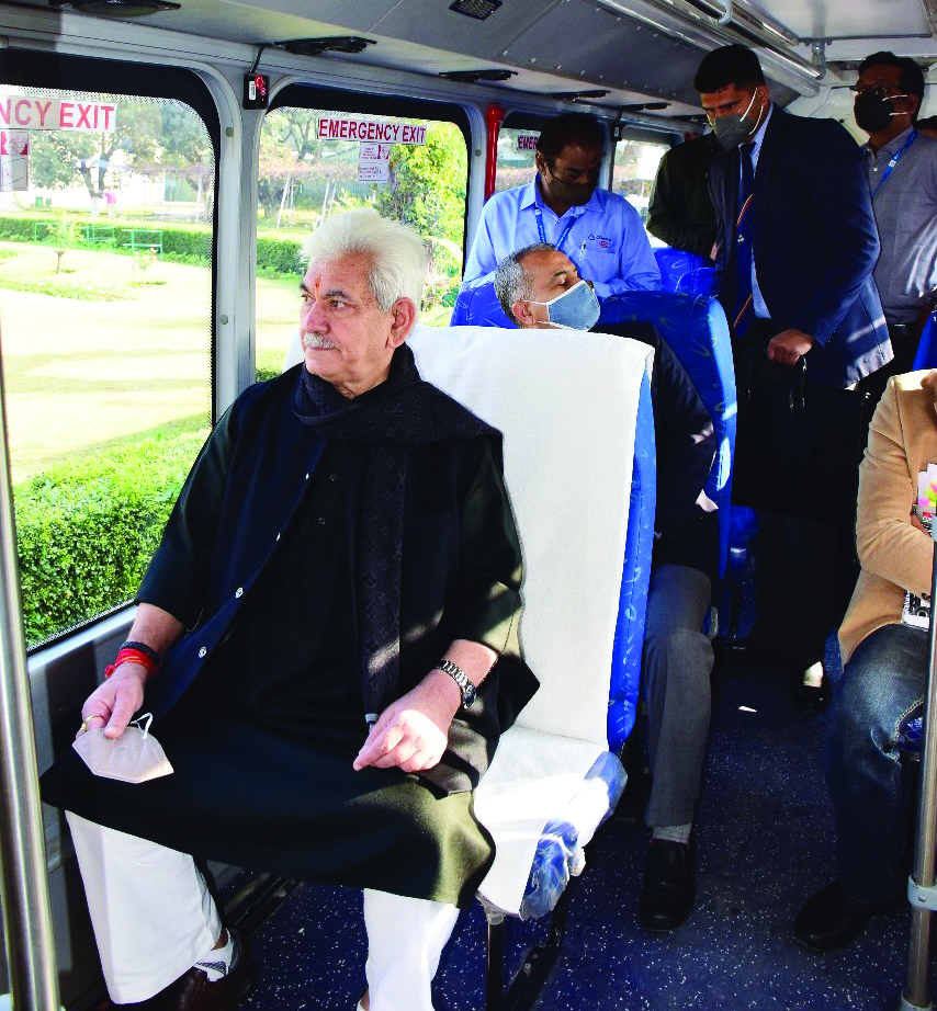 JAMMU, Dec 18: Lieutenant Governor, Manoj Sinha today took a ride in Olectra Greentech's electric bus from Raj Bhavan till Trikuta Nagar, which is on a trial run in J&K to augment inter-city and intra-city transport facilities. Sh. Arun Kumar AGM Sales and Marketing, Olectra Greentech Ltd, briefed the Lt Governor about the functioning, features and technical aspects of the bus during the ride. He apprised the Lt Governor that it is a seven meter Olectra K6 Electric Bus which has seating capacity of 24 plus driver, and single charge range of 160 KM with 80% status of charge. Briefing about the other features, the AGM apprised the Lt Governor that the bus has many other modern features like GPS, Public Announcement System, Air Conditioner, Smart Ticketing, 2 USB ports per seat, Emergency Stop etc. While enquiring about the performance of the bus, the Lt Governor suggested the representatives of the Company to keep proper luggage space to facilitate the passengers during their journey. The Lt Governor said that the J&K Government is committed to provide quality transport facilities to the public in the UT and said that the unprecedented augmentation of the public transport system will boost revenue generation as more and more viable and lucrative routes will be included in the operational network of transportation. The Electric Bus will be on trail run on different inter-city and intra-city routes to access its technical, mechanical stability and other practical aspects. Pertinently, during a meeting with the Chairman of Olectra Greentech Ltd, the Lt Governor had asked him to send two electric buses on a trial basis, one each for Srinagar and Jammu. Depending upon the trial outcome, the government will decide future course of action for inter-city and intra-city transport facilities and 150-200 e-Buses would be introduced in the transport sector soon in a phased manner.