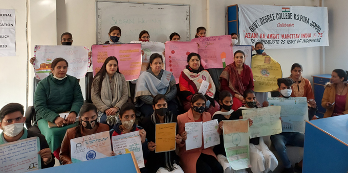 | GDC RS Pura organized "Slogan Writing Competition | | | Early Times Report JAMMU, Dec 20: As a part of Azadi Ka Amrit Mahotsav, Department of Sociology GDC RS Pura organized a "Slogan Writing Competition" on 20.12.2021 under the patronage of Principal of the college Prof. Sunil Uppal. The theme of the competition was "Know your Constitution". The event was organized by Prof. Jai Mala Thakur, HOD Department of Sociology. A total of 15 students participated in the competition with full zeal and enthusiasm and exhibited their talents and knowledge by writing slogans. Priya Choudhary of Semester 5th bagged 1st prize, whereas Shakshi Devi and Smile Choudhary of Semester-1st bagged 2nd prize and Baby Devi of Semester 1st bagged 3rd prize. The event was adjudged by Dr. Neena Gupta and Prof. Sandeep Kumari. Prof. Kiran Pathani, Dr. Anuradha Sharma, Prof. Shaveta Chowdhary, Prof. Swati and other faculty members were present in the occasion. The Principal of the college appreciated the efforts of the organizing committee and lauded the students for their active participation in such activities.