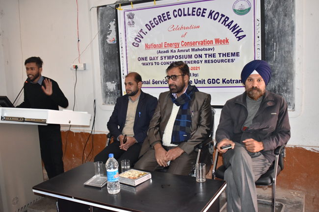 RAJOURI, Dec 20: Government Degree College Kotranka organized a symposium on the theme “ways to conserve the energy resources” today as a part of celebration of National Energy Conservation Week under the aegis of “Azadi ka Amrut Mahotsav”. The chief guest on the occasion was Prof Shakeel Ahmad Raina, Principal Govt. P G College Rajouri. The chief guest, while speaking on the occasion emphasized on the conservation of energy resources, he also congratulated the college administration for organizing this event which has acquired a great significance in today’s world. Principal of the college Dr Rajinder Singh in his address appreciated the NSS Programme officer for organizing this event. He asked the students to become a role model for awakening the society about the benefits of conservation of energy. |