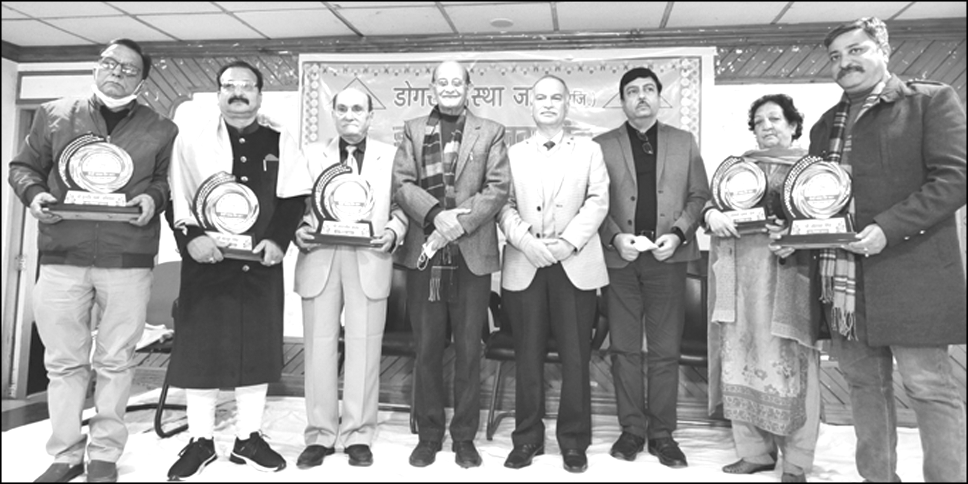 | Dogri Sanstha celebrates Manta Din by honouring veterans | | | Early Times Report JAMMU, Dec 22: Dogri Manta Din was celebrated with fervor by Dogri Sanstha Jammu in which veteran Dogri writers, artists and others working for promotion of Dogri were honoured. The function was held at KL Sehgal Hall in which Prof Manoj K Dhar, Vice Chancellor, University of Jammu was the chief guest while Prof SP Saraswat, Principal Government College for Women, Parade was the guest of honour. Those honoured on this occasion included veteran writers, Inderjeet Kesar, Krishna Prem (Sharma) and Abhishap; and renowned folk dancer and poet Khajur Singh; and senior journalist, social activist and chairperson of Team Jammu Zorawar Singh Jamwal. Before the felicitation ceremony a music programme based on Dogri songs was presented by the students of Government PG College for Women Parade namely Sameeksha, Simran Gurtu, Shriya Gurtu, Simran Pashi and Ranju Jasrotia. Tabla and harmonium accompaniment to the singers was provided by Abhishek Sehgal and Krishan Kumar Johny respectively and the songs were prepared under the supervision of Prof Anupama Sharma. Speaking on the occasion Prof Saraswat commended the efforts of Dogri Sanstha for promotion of Dogri language. He said that Manta Din is a proud day for all Dogras which should be celebrated all over the Jammu region. Prof Manoj Dhar in his address congratulated those honoured on this occasion and said that declaration of Dogri as official language of Jammu and Kashmir augers well for Dogri and will open up many new avenues for this language. He shared with the audience that Jammu University is taking all necessary steps to start the Centre of Excellence in Dogri, as desired by the Lt Governor. Prof Lalit Magotra, President Dogri Sanstha, at the very outset of the programme declared that this function is dedicated to the memory of Padmashri Padma Sachdev. He introduced the programme and shared the future plans of Dogri Sanstha and disclosed that the Auditorium of Dogri Sanstha at Karan Nagar is nearing completion, thanks to the grant of Rs 40 lakhs provided by Jammu Municipal Corporation for this purpose. The programme was anchored and conducted by Promila Manhas who also thanked all concerned at the end of the programme |