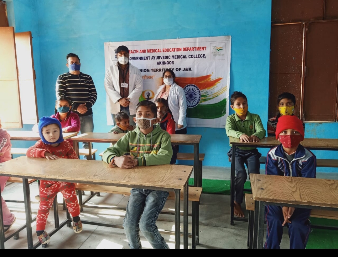 Early Times Report JAMMU, Dec 22: Department of Swasthavritta and Yoga, Government Ayurvedic Medical College (GAMC) Akhnoor Jammu conducted an awareness camp-cum-lecture in Govt Primary School Amla Chappri, Akhnoor today. The camp was attended by Dr Abhishek Magotra (Associate Professor) And Dr Sheetal Gupta (Assistant Professor). During the event a lecture was given to students regarding hygiene, dincharaya, healthy living habits and importance of Nutrition. A general hygiene check up was also done during the camp. The whole event was organized under the guidance of Prof Dr Shashi Sudan Sharma, Principal GAMC Akhnoor Jammu and Dr Narinder Sharma, Nodal Officer. Kuldeep Raj Sharma, Govt Teacher, was also present on the occasion. |