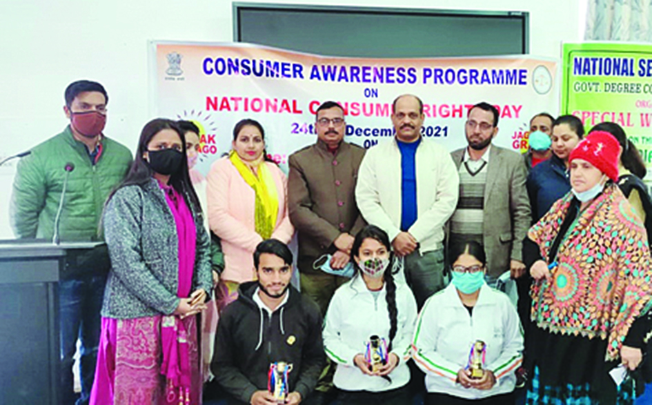 RAMNAGAR, Dec 24: To observe and celebrate National Consumer Day, NSS Unit of Govt Degree College (GDC) Ramnagar organized lecture with the theme “Consumer: Know your Rights” today as a part of Azadi Ka Amrit Mahotsav. The event was organized under the able patronship of Dr Udhey Bhanu, Principal GDC Ramnagar. The resource person and the guest of the programme were Ajay Kumar Verma, Assistant Controller Legal Meterology, Udhampur and Reeta Devi, Inspector Legal Meterology, Udhampur. The programme started with the speech of NSS Volunteers Suhani Gupta, Vidhushi Dhiman and Pritam Kumar. Then the resource person of the event Ajay Kumar Verma demonstrated the students their rights and their duties being a consumer. He also demonstrated practically the methods to determine exact weight and expiry date of Liquified Petroleum Gas available commercially and domestically. He also explained the methods and procedures to check the validity and expiry of food articles and hallmark checklist of gold ornaments. Later the volunteers were facilitated with mementos and certificates also. The programme was felicitated by Prof Suresh Kumar Dogra, HOD Physics and senior faculty member who also acquainted the students with their right behaviour whenever they purchase articles from market. The programme was coordinated by Prof Ritika Mahajan, HOD Chemistry and NSS PO of the college and Prof Harmeet Kour, HOD Botany, delivered vote of thanks. |