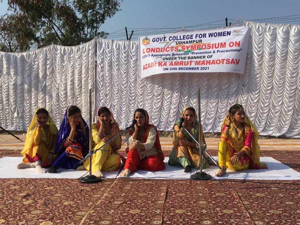 UDHAMPUR, Dec 24: Department of Music, Government College for Women Udhampur under the guidance of Prof Seema Sharma has organized different events under the banner of ‘Azadi Ka Amrit Mahotasav’ including a symposium on Covid Appropriate behaviour: Prevention and Precautions, cultural programs, a puppet show on Covid awareness and a patriotic Natak “Jang-e- Kashmir”. Principal of the college, Prof. Minu Mahajan was the chief guest on the occasion while Ritu Anand Gandotra, a renowned writer and poetess was the guest of honour. As many as 10 students participated in the symposium and expressed their message orientated thoughts on Covid Appropriate Behaviour. They discussed various aspects of COVID-19 including the meaning, prevention and control measures. A patriotic Natak “Jang-e-Kashmir was presented by artists of Paltayar Nehru Youth Club Garhi, Udhampur. The Natak directed by Sudesh Sultanpuri portrayed the prevailing conditions of Kashmir. The crisp script, catchy phrases, songs and intelligent emphasis on speech left the audience spellbound. The performance of each artist was praiseworthy. Students of the college also presented a colourful cultural program on the occasion. The main attraction of the cultural event was traditional folk song and dances like Bhakh, geetru, Gojari Mahiya. Besides, a Puppet show on the theme Covid Appropriate Behaviour was also presented. |
