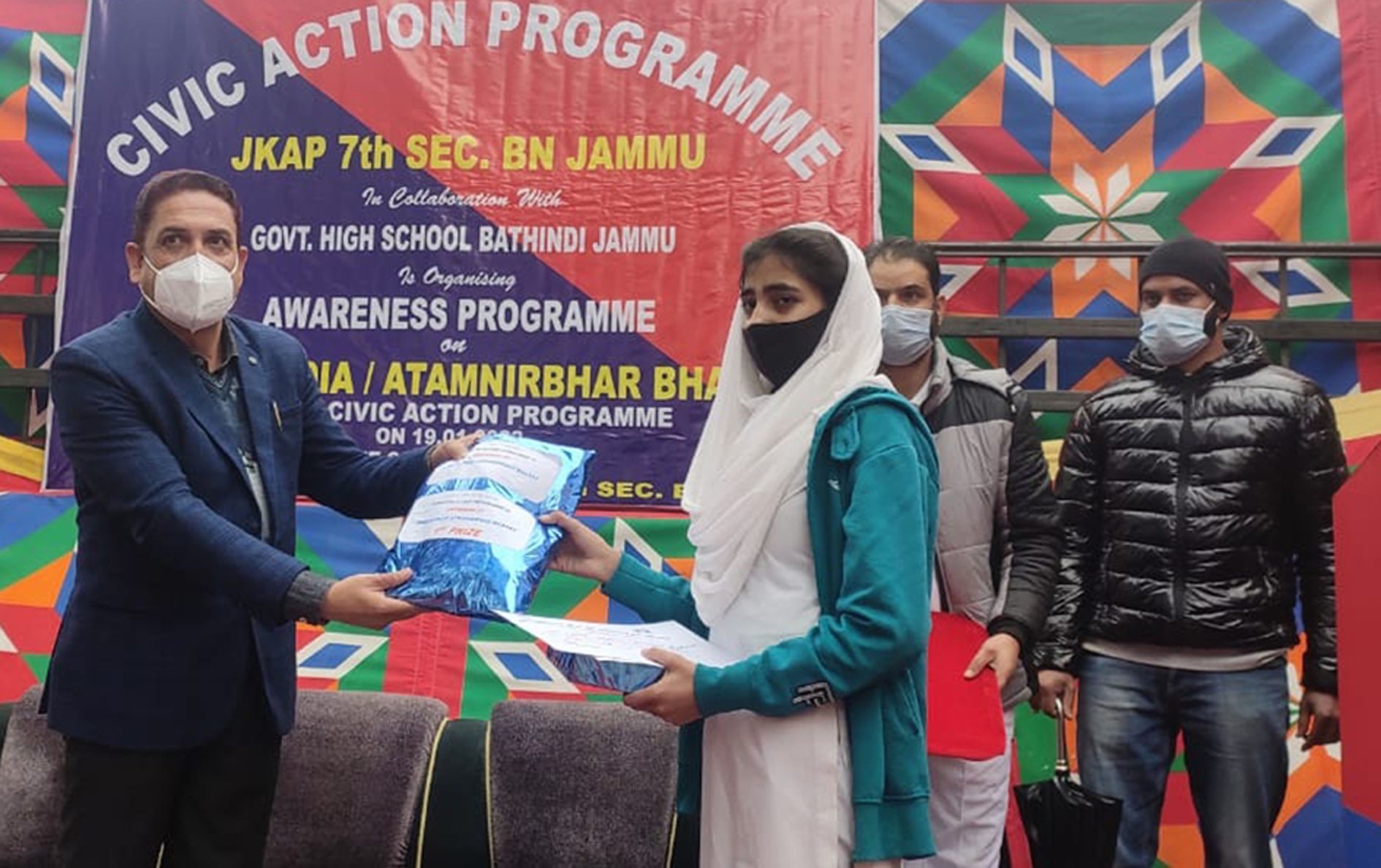 | JKAP-7th Battalion organizes civic action programme | | | Early Times Report JAMMU, Jan 20: The JKAP-7th Battalion organized civic action programme at Government High School Bathindi in collaboration with school education management. 12 students participated in debate competition on the topic "AWARENESS on MAKE IN INDIA/ ATAMNIRBHAR BHARAT. The best students were rewarded suitably and certificates were issued to them during the event. The staff /civilian & Students present on the occasion were also briefed regarding the scheme of Make in India is to make the nation self-reliant with more focus on local manufactures hubs & service providers besides, this will strengthen the economy, improve the standard of living and most importantly improve the trade deficit and the exchequer balance of the country. During the event Suneel Raj, Commandant JKAP 7th Security Battalion was accompanied by officers/ officials of this unit. |