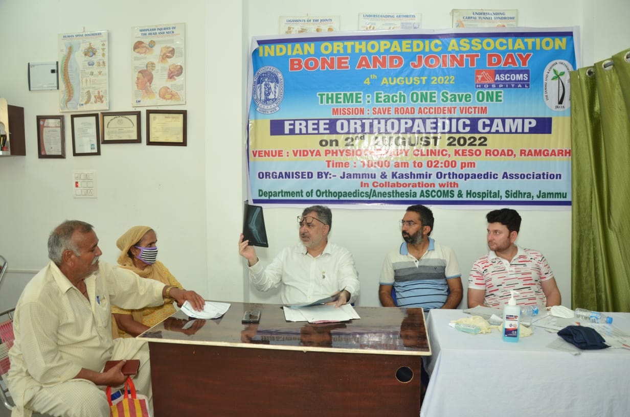 Early Times Report JAMMU, Aug 2: A free orthopaedic camp was organized today at Vidhya Physiotherapy Clinic, Ramgarh. The camp was organized by the Departments of Orthopaedics and Anaesthesia, ASCOMS & Hospital, Sidhra, Jammu in collaboration with Jammu & Kashmir Orthopaedic Association. The camp was inaugurated by D K Manyal, Ex-MLA Samba, D K Batra, Secretary, ASCOMS & Dr. Rajesh K. Gupta, Prof & Head, Orthopaedics ASCOMS & President, J&K Orthopaedic Association. This camp is a part of Bone & Joint Day activities. The Bone & Joint Day is celebrated all over India on 4th of August every year. To celebrate this day, Indian Orthopaedic Association and Jammu & Kashmir Orthopaedic Association have planned number of activities all over the State for the benefit of poor and needy people. Around 400 patients were examined in the camp by a team of Orthopaedic Surgeons of the Department of Orthopaedics namely Dr. Shafiq Hackla, Dr. Nitish Sharma, Dr. Sunny Sharma and Dr. Akshay Khajuria, headed by Dr. Rajesh. Free medicines were also distributed to the needy patients. The patients were also screened for free surgeries which will be conducted at ASCOMS & Hospital, Sidhra. Moreover, training to the general public on Basic Life Support was also given by a team of Doctors from Department of Anaesthesia, ASCOMS & Hospital. |