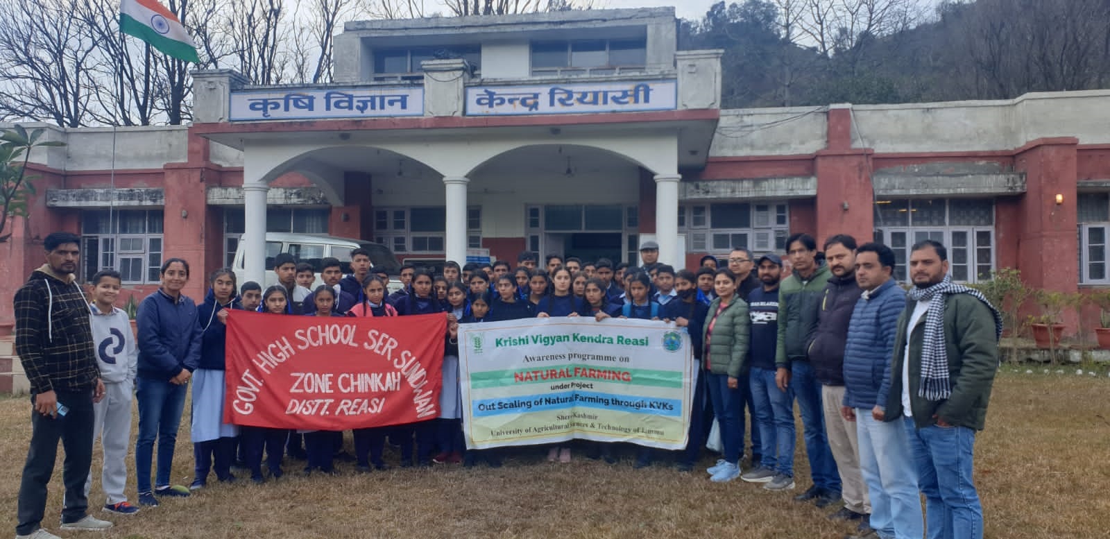 | Krishi Vigyan Kendra, Reasi organizes Awareness Programme on Natural Farming | | | Early Times Report REASI, Feb 10: Krishi Vigyan Kendra (KVK), Reasi under the administrative control of Sher-e-Kashmir University of Agricultural Sciences and Technologies Jammu (SKUAST-J) organized awareness programme on natural farming under "Up scaling of natural farming through KVKs" project here at KVK, Reasi campus in Reasi distt. of J&K which was enthuastically attended by a number of school children and teachers from Govt. High School Ser Sundwan in Reasi distt. of J&K. The programme was organized under the able guidance of Director Extension, Prof. SK Gupta of SKUAST-J. The programme was organised to create awareness among the school children and teachers on natural farming. The programme was inaugurated by Sr. Scientist & Head of KVK, Reasi, Dr. Banarsi Lal. During the inaugural session he said that natural farming is the need of the era and informed that it is beneficial for the maintenance soil health and environment. He further said that Reasi district of J&K has huge potential in natural farming and more entrepreneurial opportunities can be created among the farmers by producing the quality and safe food through natural farming. He stressed on the cluster based approach for the adoption of natural farming. He narrated that natural farming is agro-ecology based farming which integrates crops, trees, livestock and functional biodiversity. He elaborated the four pillars of natural farming and stressed on the adoption of zero budget natural farming. Earlier Dr.Lalit Upadhyay, Scientist warmly welcomed the participants and briefed the significance of natural farming. He said that for a healthy society, healthy food is required and natural farming can play the significant role for the production of safe food. He also discussed in detail on the soil and environmental health. Dr. Suja Nabi Qureshi guided participants on the commercial organic horticulture practices and said that natural farming is a promising means of reducing the dependence of farmers on external inputs, reducing the cost of cultivation and increasing the income of the farmers. Dr. Arvinder Kumar discussed on the entrepreneurship development in agriculture and guided participants on scientific cultivation of Rabi and Kharif crops. Dr. Lobzan Stanzen discussed on the importance agrometrology and spoke on the usage of indigenous seed and bioinoculants as the catalyst required for natural farming. Preeti Chaudhary stressed on the balanced nutrition among the children and said that natural farming can play a significant role in maintaining soil and environmental health. KVK Scientists also discussed the preparation of Jeevamrit, Beejamrit, Panchgavya etc. Participants also visited the natural farming model of KVK, Reasi and other demonstrated units such as hydroponics unit, vermicompost unit, polyhouse unit, mushroom unit and showed keen interest in the technologies demonstrated by KVK. Govt. High School Ser Sundwan School teachers Shivangi Gujral, Sunil Kumar and Uttam Singh also present during the programme who appreciated KVK, Reasi for organizing such a useful programme. The programme was assisted by Manohar Lal and concluded by Dr. Suja Nabi Qureshi with the formal vote of thanks. |