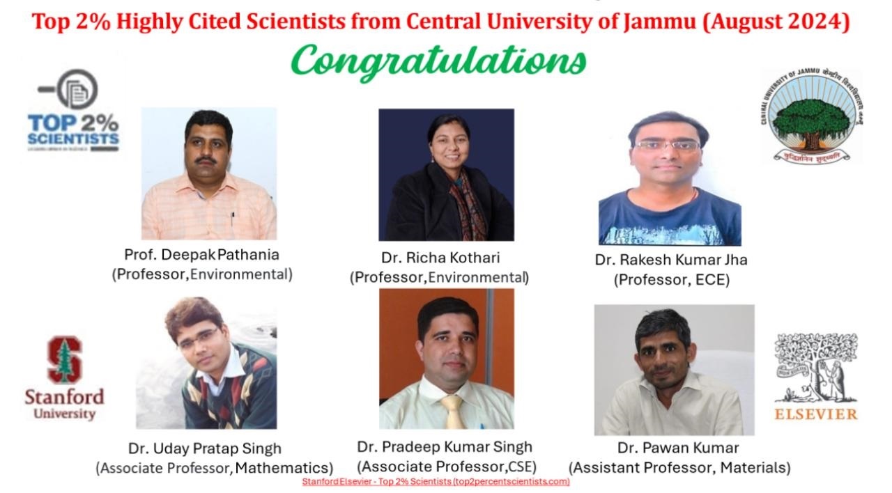 Early Times Report Jammu, Sept 22: John P.A. Ioannidis of Stanford University and Elsevier BV- a leading scientific publisher has recently published an update of his study of the global top 2% of most widely cited researchers into 22 scientific fields and 174 sub-fields, according to the standard science-metrix classification. This ranking, considered one the most prestigious worldwide, is based on standardized information on citations, h-index, co-authorship adjusted hm-index, citations to papers in different authorship positions, and a composite indicator (c-score) update in August 2024 data includes more than 217000 researchers categorized. Six faculty members of Central University of Jammu have made it in the Top 2% Scientists of the World list released by Stanford University (SU) recently. The selection is based on the top 1,00,000 scientists by c-score or a percentile rank of 2% or above in the sub-field including Prof. Deepak Pathania, Prof. Richa Kothari, Prof. Rakesh Jha, Dr. Uday Pratap Singh, Dr. Pradeep Kumar Singh and Dr. Pawan Kumar. This is the Second time highest ever number of Central University of Jammu teachers in top 2% list, which majorly consists in Environmental Science, Electronic Engineering, Computer Engineering, one in Mathematics and one in Material Science. On this occasion, Prof. Sanjeev Jain, Honorable Vice-Chancellor, Central University of Jammu congratulates all faculty members. This is our best showing in the list. When it first started around 2020, there were only 03 professors in the first edition. Now we have been able to double the number in the last two conjugated years. He added that the University continues to improve its track record of excellent achievements by the faculty members, where its faculty has won several prestigious awards and honors, bagged coveted prizes, secured competitive grants, and filed national and international patents. The University is also known for its publication record, wherein the faculty members continually publish their research findings in refereed journals of international repute. |