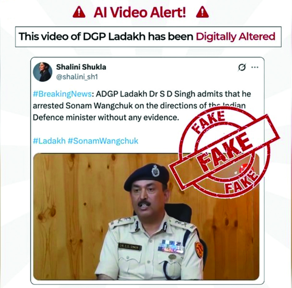 JAMMU, Sept 30: A viral video, in which Ladakh Director General of Police S D Singh is seen claiming that activist Sonam Wangchuk was arrested on directions of the Defence Minister, is deep fake, the Press Information Bureau said on Tuesday It said the DGP has made no such statement. “A digitally altered video of Ladakh DGP Dr S D Singh is circulating on social media, in which he is shown making claims that Sonam Wangchuk was arrested on directions of the Defence Minister, without any evidence,” the PIB’s Fact Check unit said. “Beware of such AI-generated videos shared with the intent to mislead public and cause confusion and panic,” it said. The PIB Fact Check unit further advised people to stay vigilant, always verify content before sharing, and help curb the spread of misinformation. |