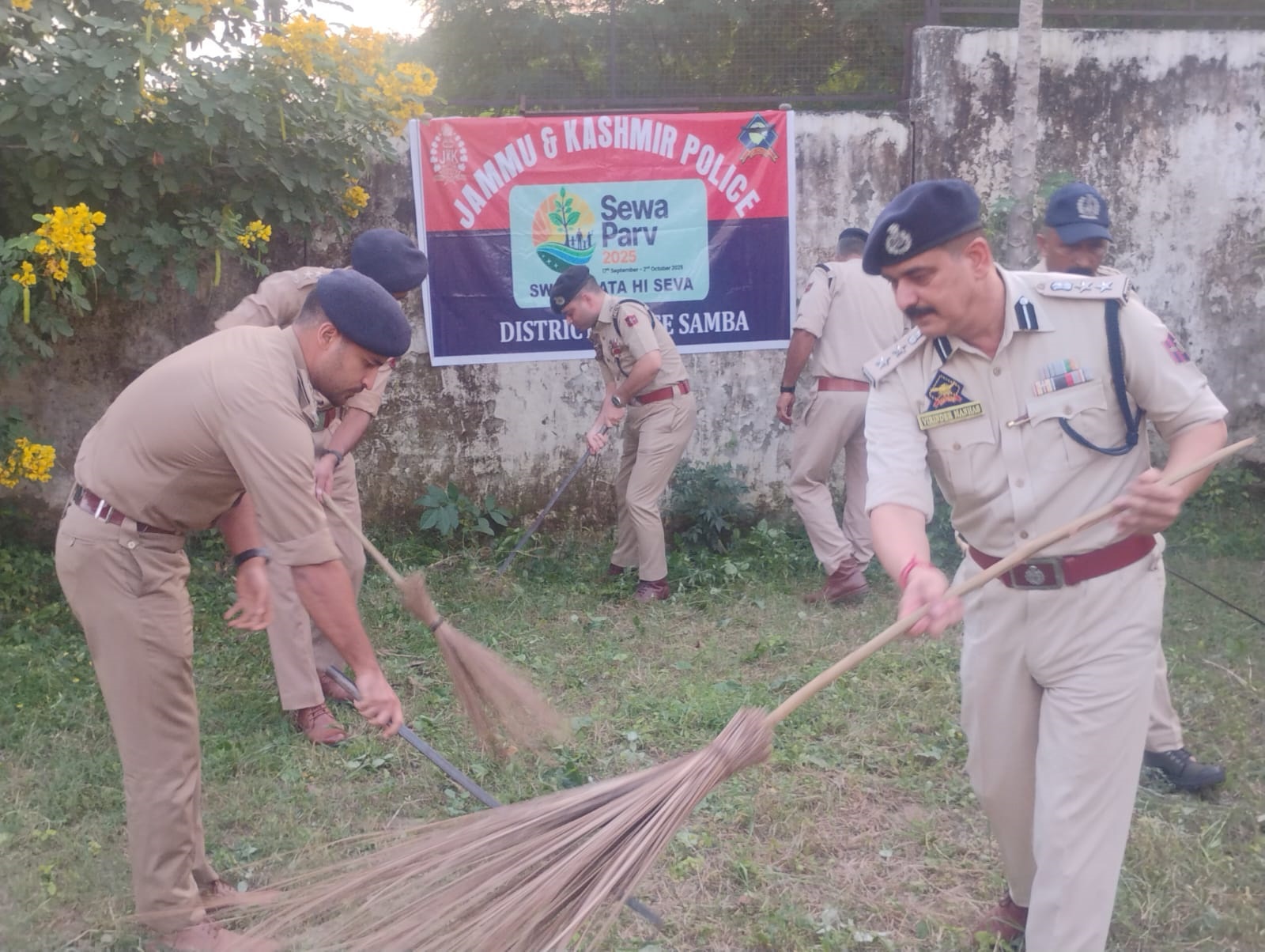 Samba, Oct 1: As part of the ongoing nationwide Sewa Parv–2025 celebrations, Samba Police organized cleanliness drives across all District Police establishments with active participation of all police personnel. The cleanliness drive at District Police Office was led by SSP Samba, joined by other Police Officers and staff members of DPO Samba. The cleanliness drives were also carried out in the premises of other Police establishments including Police Stations, Police Posts, Border Police Posts, District Police Lines and Police Sub-Division Offices in which all officers and officials collectively undertook sanitation exercises with full zeal and commitment. On the occasion, SSP Samba emphasized upon maintaining a culture of cleanliness & proper hygiene within police establishments and promote a healthy work environment. He appreciated the enthusiastic participation of all ranks and urged that such practices should be continued regularly.