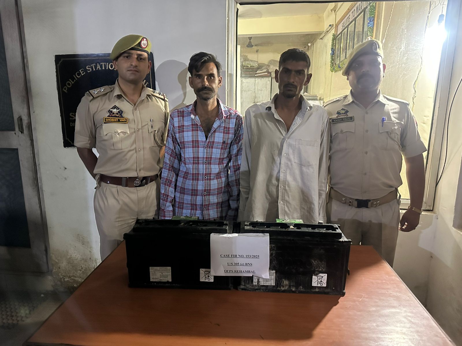 Udhampur, Oct 2: On the written complaint of one person namely Kuldeep Kumar S/O Uttam Kumar R/O Channi Morh, Tehsil & District Udhampur, regarding theft of two batteries from vehicle Truck No. JK14B-8272 attached with PHE Civil Udhampur, a case FIR No. 153/2025 U/S 305(e) BNS was registered at Police Station Rehambal. During the course of investigation, the police team of PS Rehambal led by its SHO, two accused persons namely Pritam Singh S/O Kali Dass R/O Garhi, Udhampur and Mohd. Salim S/O Shah Mohd. R/O Garhi, Udhampur were arrested. On their disclosure, both the stolen batteries are worth approximately ₹20,000/- were recovered.