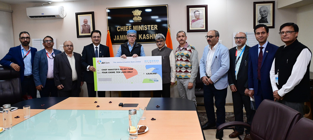 J&K Bank contributes Rs 4.10 crore to CM's Relief Fund for flood-affected families | | | Early Times Report SRINAGAR, Oct 3: Jammu and Kashmir Bank today contributed an amount of ?4 crore and 10 lakh to the Chief Minister's Relief Fund to support ongoing relief and rehabilitation measures for the people affected by the recent floods in the Jammu and Kashmir. The Managing Director & Chief Executive Officer of J&K Bank, Amitava Chatterjee, along with members of the Board of Directors, handed over a cheque of ?4.10 crore to Chief Minister Omar Abdullah at the Civil Secretariat here. The Chief Minister appreciated the significant contribution of J&K Bank and extended gratitude to its management and employees. He said such solidarity from institutions reflects the collective resolve to stand by the people in times of distress and will greatly help in easing the hardships of flood-affected families. Thanking the Bank staff for their commitment, the Chief Minister remarked that J&K Bank has always been at the forefront of supporting the community in testing times, and this gesture once again demonstrates its deep sense of responsibility towards the people of Jammu and Kashmir. |