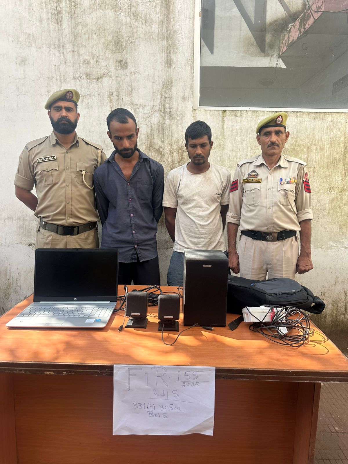 Udhampur, Oct 5: Continuing its efforts to curb theft-related crimes, Udhampur Police has successfully solved one more theft case reported from Government Middle School Khudan Neela (Zone Tikri). An FIR No. 155/2025 U/S 305(a), 331(4) BNS was registered at Police Station Rehambal on 04.10.2025 on the written complaint of one Sham Lal Sharma (School Teacher) S/O Hem Raj R/O Mananu, Sunari regarding theft of electronic items from the school by unknown persons. During the course of investigation, Police team of PS Rehambal arrested two accused persons namely: Siat Mohd @ Sajad Mohd S/O Gulzar Mohd R/O Sunari, Hartaryan, Udhampur Asquer Ali S/O Manzoor Ahmed R/O Chal Rakhwal, Udhampur On sustained questioning, both accused confessed their involvement in the theft and disclosed that they had stolen a laptop, speakers, and an extension board from the said school during the midnight of 28th September 2025. On their disclosure, the stolen electronic items worth approximately ₹70,000 were recovered by the police team.