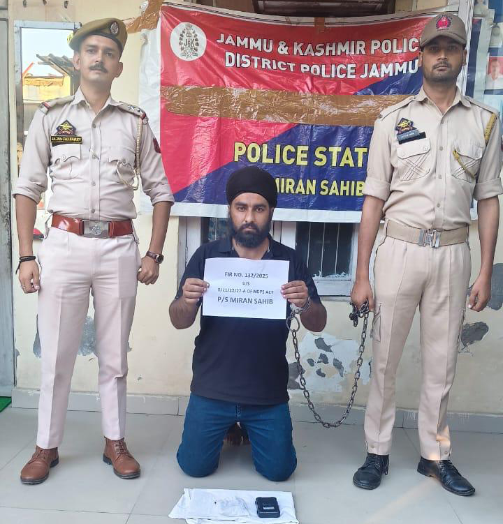 | Miran Sahib police arrested drug peddler | | | Early Times Report JAMMU, Oct 10: In a determined and strategic move to clamp down on the rising threat of narcotics in the region, the Miran Sahib Police Station has scored one more success by apprehending a known drug peddler and seizing a significant quantity of contraband. The arrest underscores the police department's continued efforts to root out the drug trade and protect the community from its harmful impact. The operation, led by a vigilant team from Police Station Miran Sahib, resulted in the arrest of Nirmal Jeet Singh, son of Amreeq Singh, a resident of Ward No. 04, Simbal Camp Upon apprehension, the police recovered 21.77 grams of a heroin-like substance (including polythene packaging) from his possession. This marks a notable seizure in the ongoing crackdown on illicit drug trafficking in the area. A case has been registered under FIR No. 131/2025, in accordance with Sections 8, 21, and 22 of the NDPS Act, and a detailed investigation has been launched. The police is currently pursuing leads to uncover both the backward and forward links of the accused, which may include suppliers and other individuals connected to the drug network. This investigation aims to dismantle the wider chain of narcotic distribution operating in and around the region. Inspector Azad Manhas, SHO Police Station Miran Sahib leads the Police team under the supervision ofSDPO R S Pura and SP Headquarters Jammu that leads to successful operation and ensured immediate legal action was initiated against the accused. The Jammu & Kashmir Police appeals to the citizens to remain vigilant and report any suspicious activities related to drugs in their locality. The success of this operation reaffirms the department's pledge to maintain law and order, and to lead from the front in the fight against drug abuse. The war on drugs continues-with stronger resolve and community cooperation. |