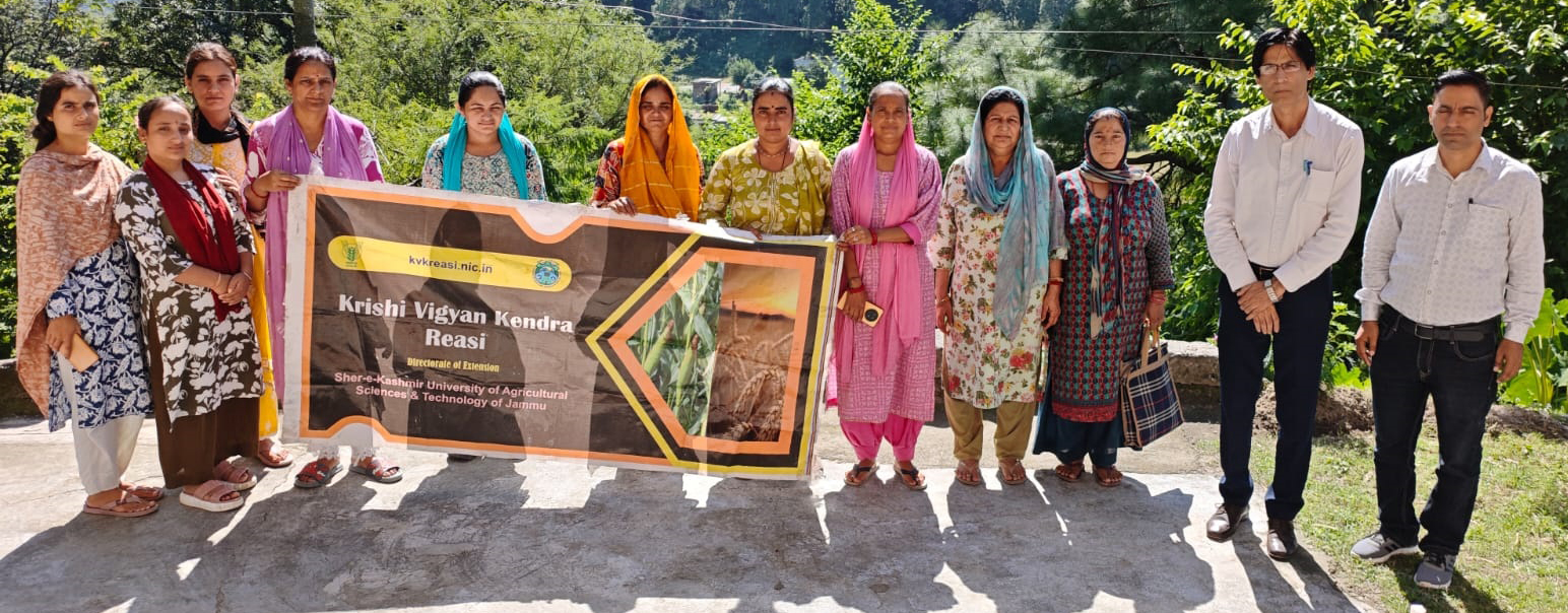 | KVK Reasi organises training programme | | | Early Times Report REASI, Oct 10: Krishi Vigyan Kendra (KVK), Reasi under the administrative control of Sher-e-Kashmir University of Agricultural Sciences and Technology of Jammu (SKUAST-J) organized one day training programme on "Self Help Groups(SHGs) & Women Empowerment" here at Saldi village in Reasi district of J&K which was actively attended by the number of women members of the area. The programme was organised under the dynamic stewardship of Hon'ble Vice Chancellor, Prof. B.N. Tripathi and able guidance of Director Extension Prof. Amrish Vaid of SKUAST-J.Dr. Banarsi Lal,Chief Scientist & Head of KVK Reasi warmly welcomed the participants and briefed the significance of Self Help Groups (SHGs) in the current scenario of livelihood diversification especially for the marginalized rural women of hilly areas. He guided trainees on regular saving, budgeting, record keeping, regular meetings, regular interloaning, linkage with banks etc. He spoke in detail on the agri-entrepreneurship development at village level by working in groups and discussed on Atama Nirbhar Bharat. He highlighted the importance of homogeneity, fortnight meetings and book keeping for the significant results in SHGs. He spoke in detail on the value addition in fruits, vegetables and spices to enhance the income and employment among the rural women. He alaso guided the participants on packaging, labeling, branding and marketing of processed agro-products. He spoke on commercial organic and natural farming to reduce the cost of cultivation and increase the quality of products. He also guided participants on various incomes generation activities among the rural women and suggested them to stress on the value addition in agriculture for more farm returns. He guided trainees on commercial floriculture, mushroom cultivation, organic vegetables production etc. He also discussed on woman empowerment and said that SHGs can be helpful to empower the rural women. He expressed that SHGs formation has an immense scope in hilly areas and can play a significant role in improving the socio-economic status of rural women.
