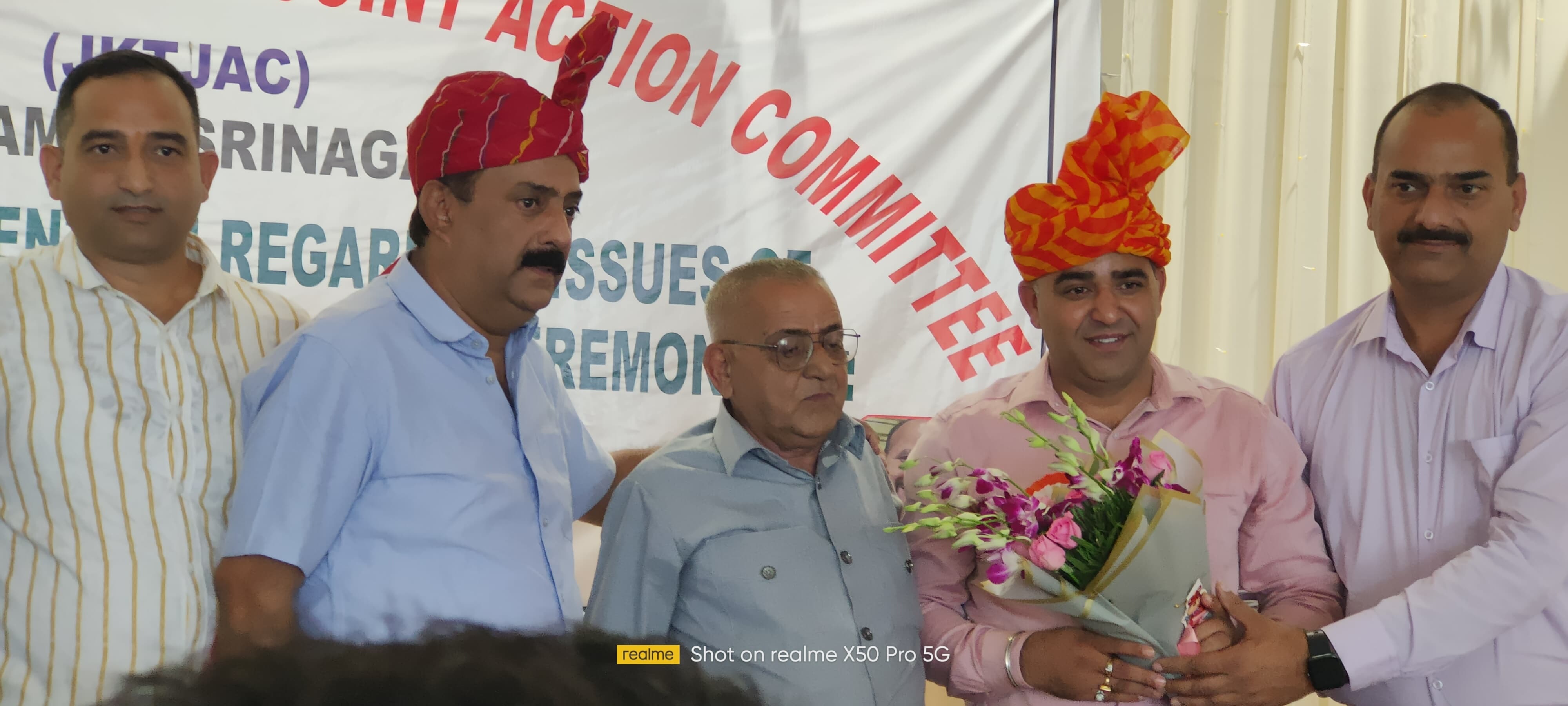 Jammu, Oct 13: Jammu Kashmir Teachers'Joint Action Committee today organised one day convention regarding the issues of the teachers at Udhampur where in Employees Joint Consultative Committee President Ajaz Ahmed Khan was the Chief Guest. On the occasion Oath Ceremony was held of the newly elected UT President JKTJAC Vinod Sharma, UT Chairman Saleem Sagar and UT General Secretary Najam Jafri. The Oath was administered by JKTJAC Election Commission Members Lekh Raj Parihar , Malik Ashraf, Sajad Malik, Naresh Sharma, Azmat Iqbal and Mushtaq Ahmed Khan. The occasion was attended by hundreds of teachers of District Udhampur besides JKTJAC leadership from all the districts of Jammu and Kashmir. After taking Oath UT President Vinod Sharma while speaking assured that he will come up to the expectations of the teaching fraternity who have given him another chance to serve. He assured to take up the genuine issues of the teaching fraternity with the government for their resolution. He said that issue of allocation of substantive posts, DPC of all cadres, transfer policy in favour of teachers appointed under ReT scheme, Sanction of posts of masters in Middle schools upgraded under SSA are under active consideration of JKTJAC. Saleem Sagar while speaking appealed the Govt to implement old Pension Scheme in favour of employees appointed on or after 01.01.2010. He also demanded release of pending Mid Day Meals dues which the teachers have managed from their own pockets. Speaking on the occasion Najam Jafri raised the issue of Regularisation of left out ReTs and conversion of RRETs to Teachers Grade II/III. Ajaz Ahmed Khan President EJCC while speaking on the occasion demanded release of GP Fund bills of the employees of the UT. He also demanded Regularisation of adhoc and daily rated workers. Others who also spoke on the occasion were:-Rajesh Singh Jamwal, Parvez Iqbal Shah, Sham Parkash sharma, Aaftab Malik, Sukesh khajuria, khazan Singh, Abdul Rashid, Mahesh Kumar, Rishi Singh Rana, Javed Bali, Ashok Sheth, Ch. Shabir Khan ,Ravinder Manhas, Pir Mushtaq, Balwan Singh, Hari Lal Nag, Tahir Masood, Dinesh Singh Samyal, Rakesh Singh bunty, Shahnawaz Hussain, Ravinder Chib, Pritam Goswami, Ravinder Singh Rathore, Shamsher Singh, Rekha Thakur, Subash Brahmanu, Bhushan khajuria, Suresh Sharma, Balvinder Singh, Rakesh Singh, Vipen Raina, Raman Sharma, Sham Singh, Manchand Khajuria, Anil Sharma, Swarn Singh, Sudesh Kumar, Rakesh Salaria, Amit Gupta, Prashant Sharma, Vinay Sharma,Rajinder Singh, Ajit Singh, Mohd Mustfa, kuldeep singh, Narinder Singh, Shila sharma, kamlesh kumari, Nazia Akhter, Rashi Sharma,Nisha Kumari, kamlesh Rajput, Mohinder Partap Singh, Shabbir Sheik, Lal Singh, Ashish Gandotra, Mangat Choudhary, Reeta, Anita, Sonika, Anu Devi, Avinash Magwan, Arvind Thakur, Mohd Yusuf Shah, Ranjeet Singh, Pankaj Thakur, Rajeev Sharma, Ajay Sharma, Sunil Singh,Jagdish Chander Sharma, Shankar Singh, Subash Chander, Jai Parkash, Gagan Singh ,Meena Rajput, Santosh Kumari, Vijay Devi, Inderjeet Singh, Sunita Devi and others.